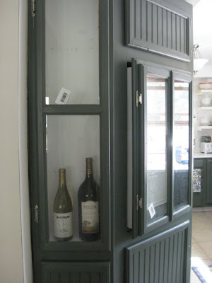 The next set of cabinets have two glass panes that open in the middle and although I don't have the shelves or trim in, I will be able to use this upper cabinet for display. RC put a piece of the tin ceiling in for the back and I don't like it. I don't know what I will do with it, paint it for sure, but what color?