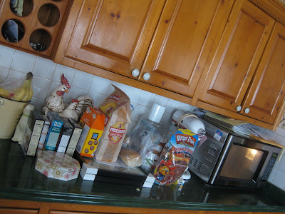 Now you may be looking at the above picture and thinking, "Oh. This is how Blondie stocks up for a snowstorm...a lot of Rice A Roni, dog snacks and taco chips." Wrong. This is a small example of what I wake up to every morning. Granted., I pushed everything back and as close together as possible to look neater, and wiped the counter tops off (I don't want to air too much dirty laundry at once, for Pete's sake, and who is Pete?). I just want to ask you, are you the type that cleans up before you go to bed or do you just leave it all until the morning? It seems that even if I do a white glove number in my kitchen after dinner and I am the last one to go to bed, a mysterious little Messy Fairy comes in during the night and I wake up to a disaster. When I get up in the morning I like to have a couple of cups of coffee and catch up on some blogs. And having a counter full of stuff and a sink full of dishes (okay, sometimes they haven't even made it to the sink) waiting for me can really take the joy out of the morning.