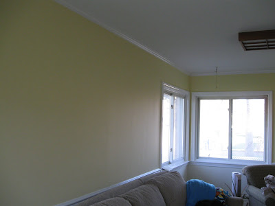 Above the chair rail is a buttery yellow called Flax by Pittsburgh Paints and below is a very pale yellow called Lotus Flower. It's almost white with a hint of yellow. It's hard to tell from the picture, but my furniture is beige and mossy green. The trim was painted a stock white.