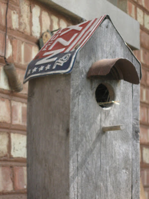 Above is a birdhouse I have had forever. I found it in Michigan and it has a Michigan license plate for a top and half of a tin can for a little 'awning'. I have a little family of sparrows in it right now. It's on my patio and I think I scare them when I go out there. Lucky for them it is still a little too cool to be out.