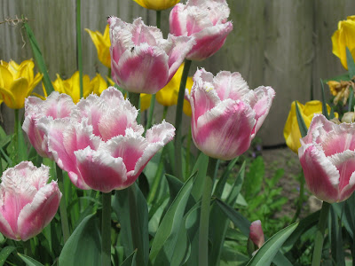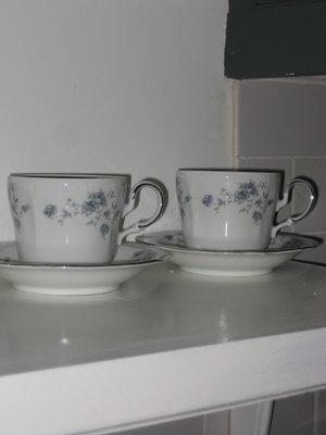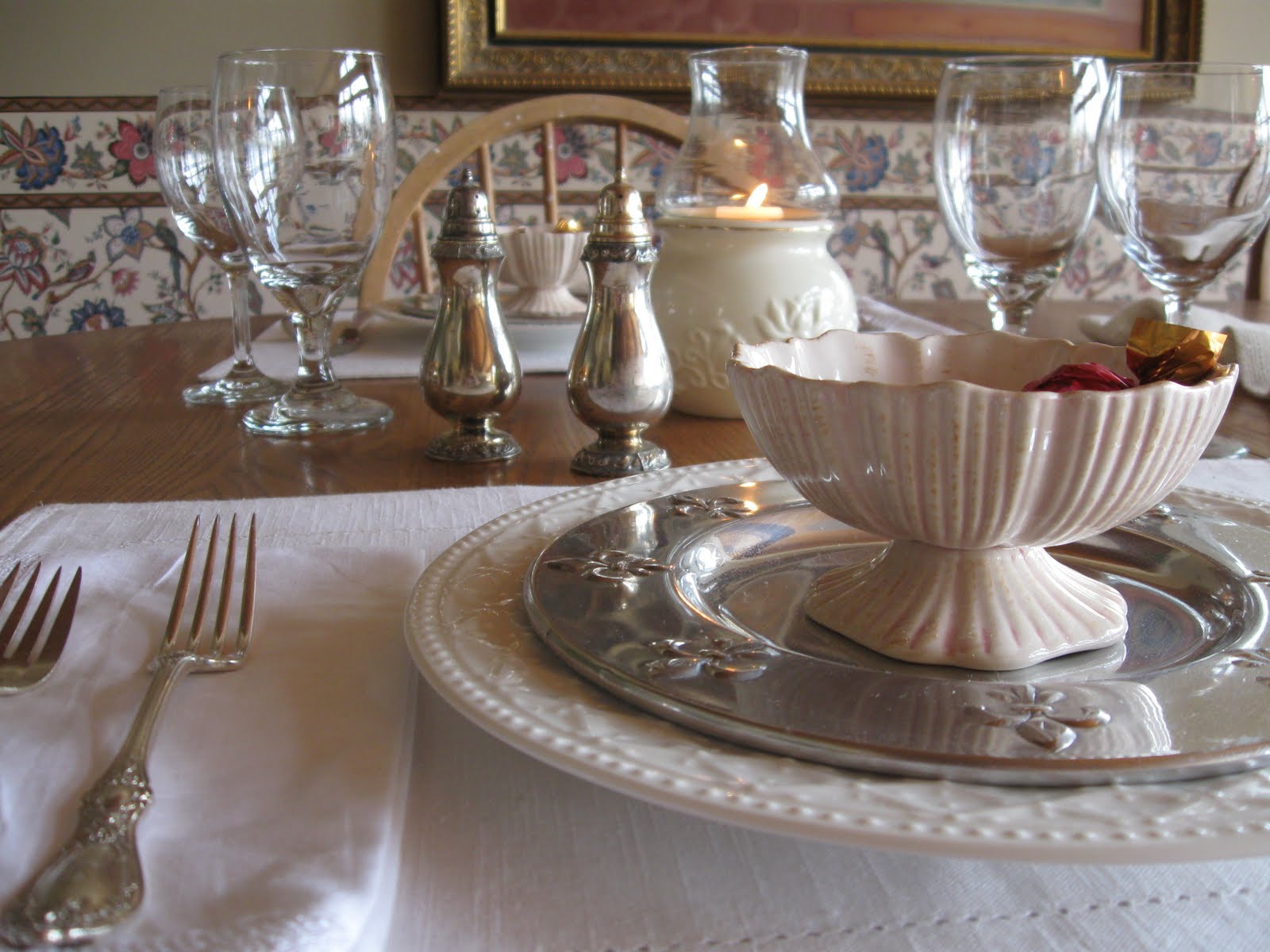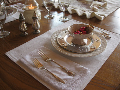 The dinner plates are my every day Gibson and I picked up the pretty fleur de lis salad plates at my favorite floral/gift/ antique store in White Pigeon, Michigan. Don't you just love shops with a little of everything? Topping everything are dessert cups from Anthropologie in a very pale pink and I plopped a few Godiva truffles in them. Yum!Everyone seemed to have glorious weather this weekend. Well, it was sweatshirt weather for us. I cleaned up the Summerhouse and The Husband cleaned up the grills. We started putting patio furniture out. Of course, we can still have snow, this being the crazy Midwest! But we enjoyed ourselves, had burgers on the grill and cozied up for some television when the nights turned cool. Lovely weekend. Hope you had one, too.