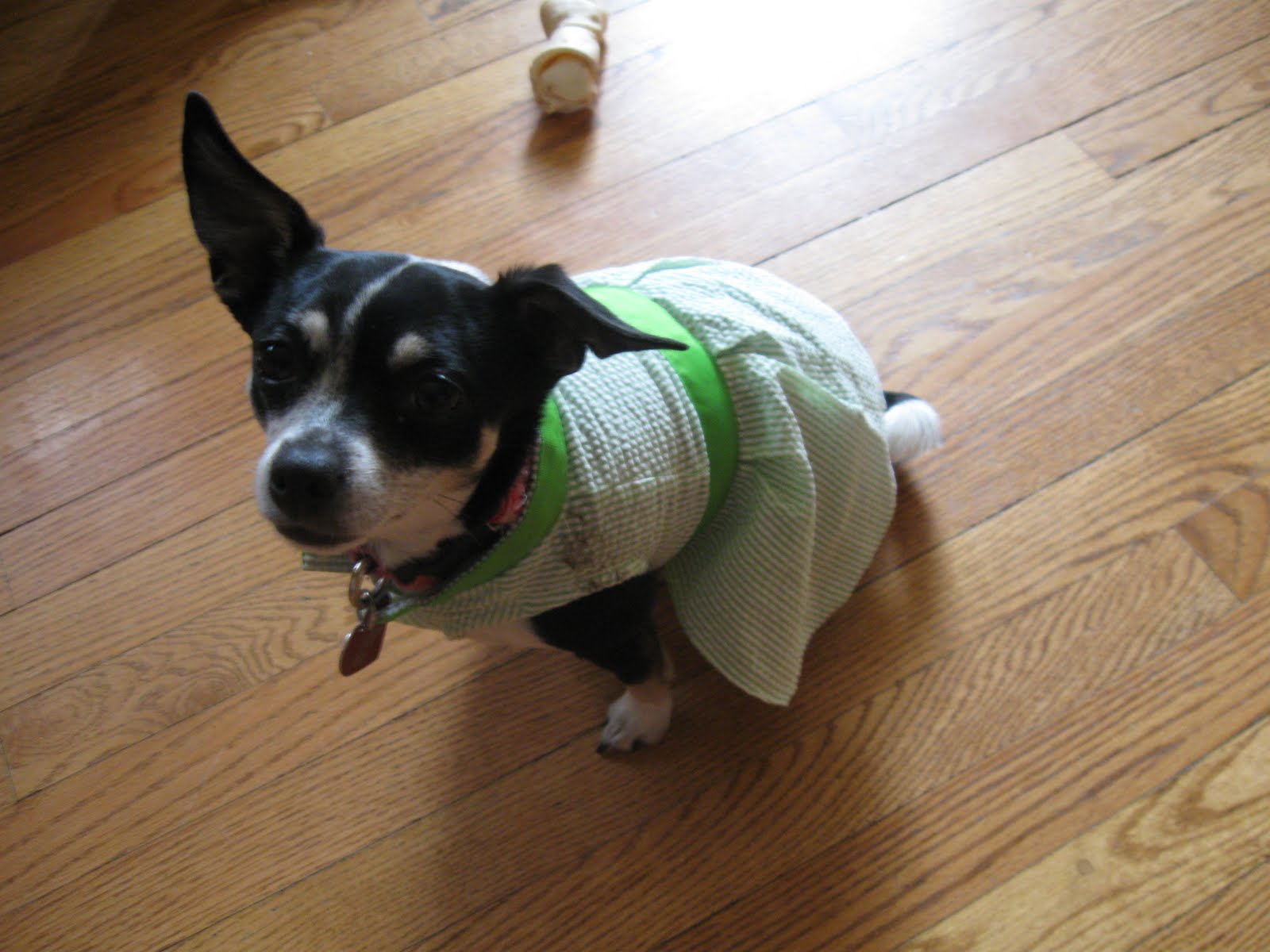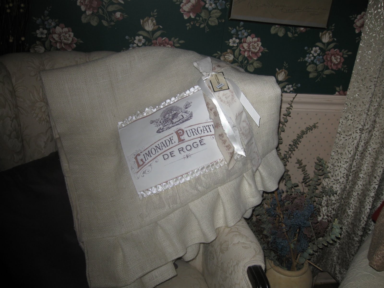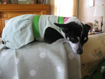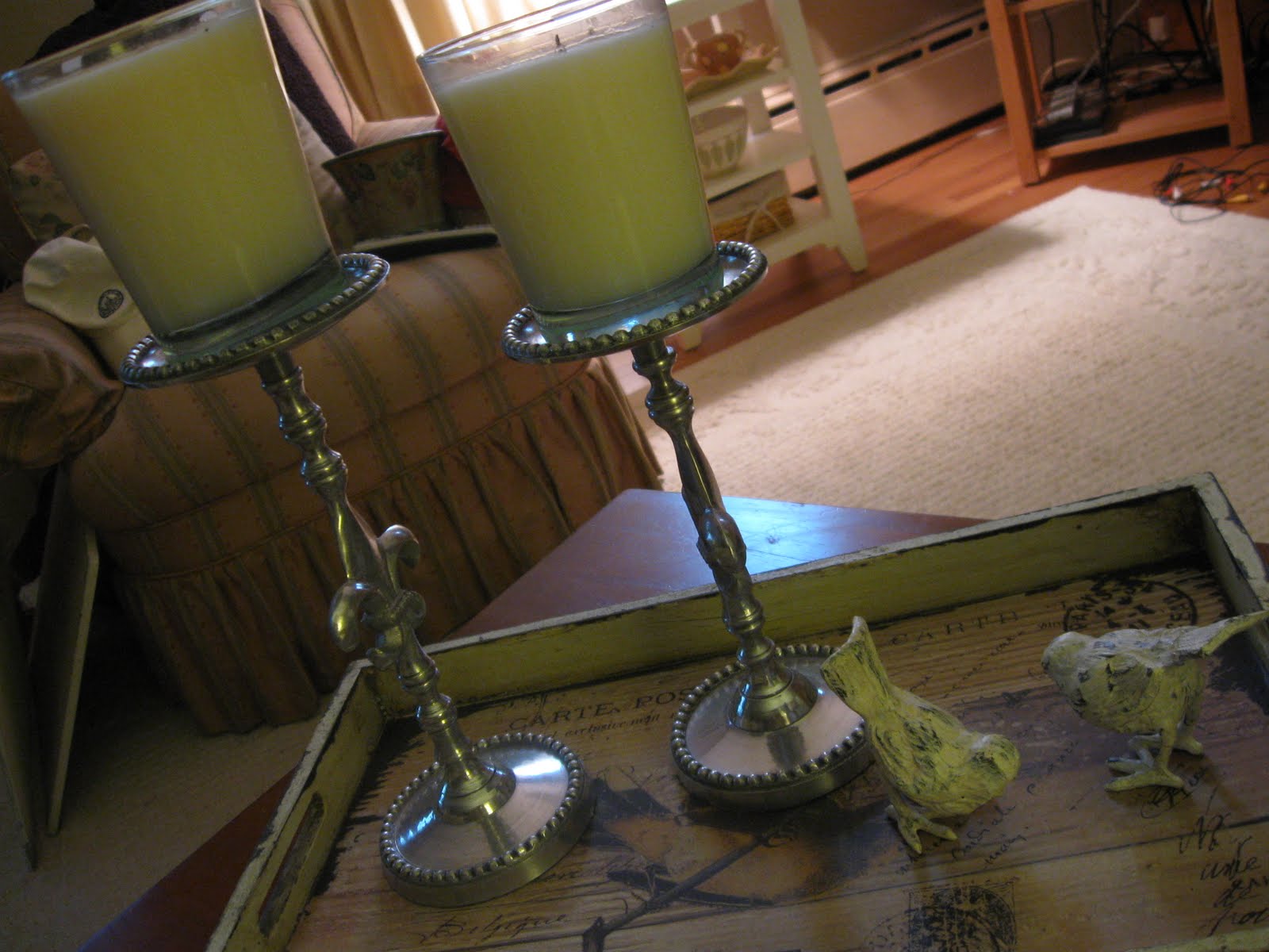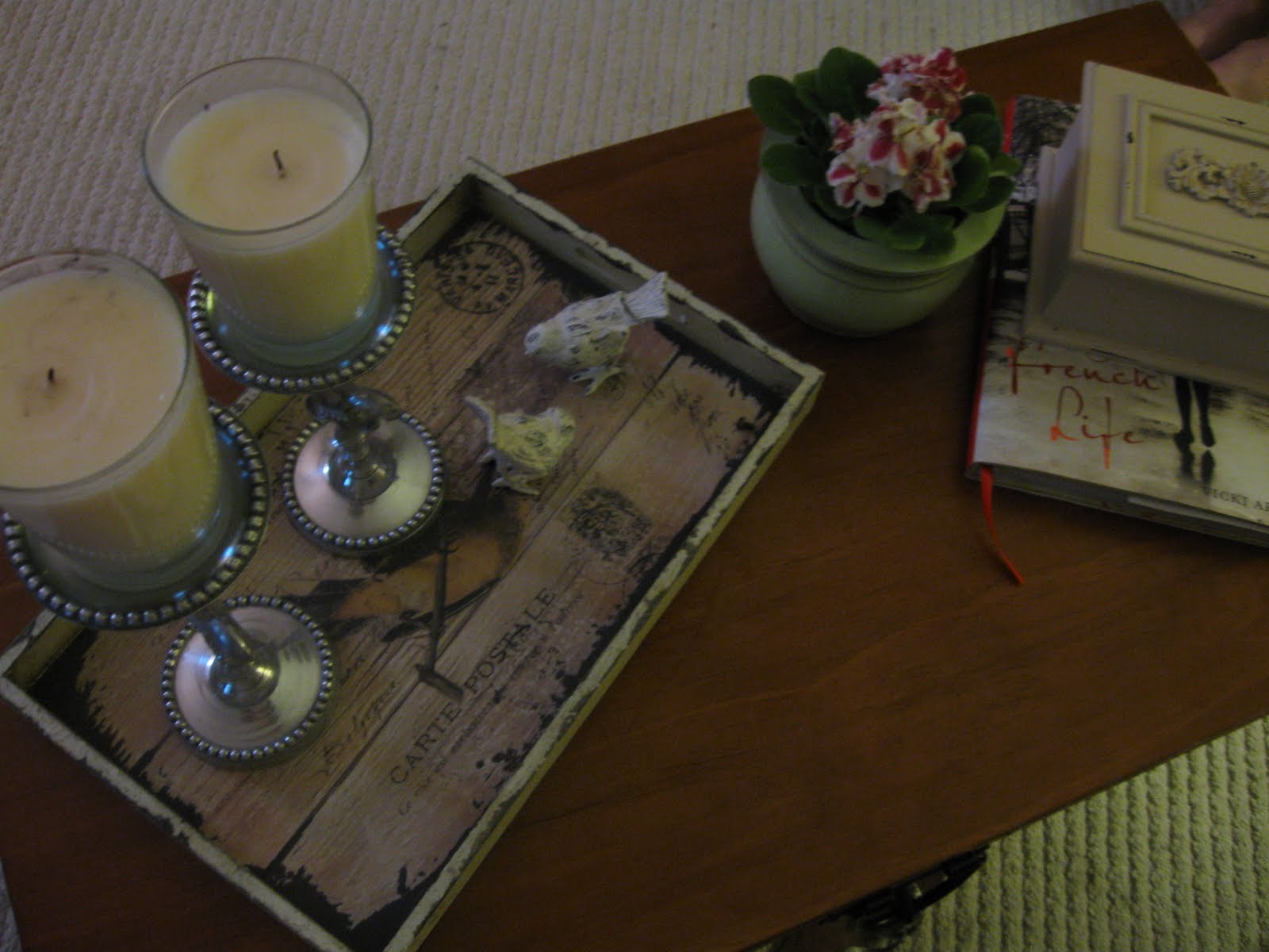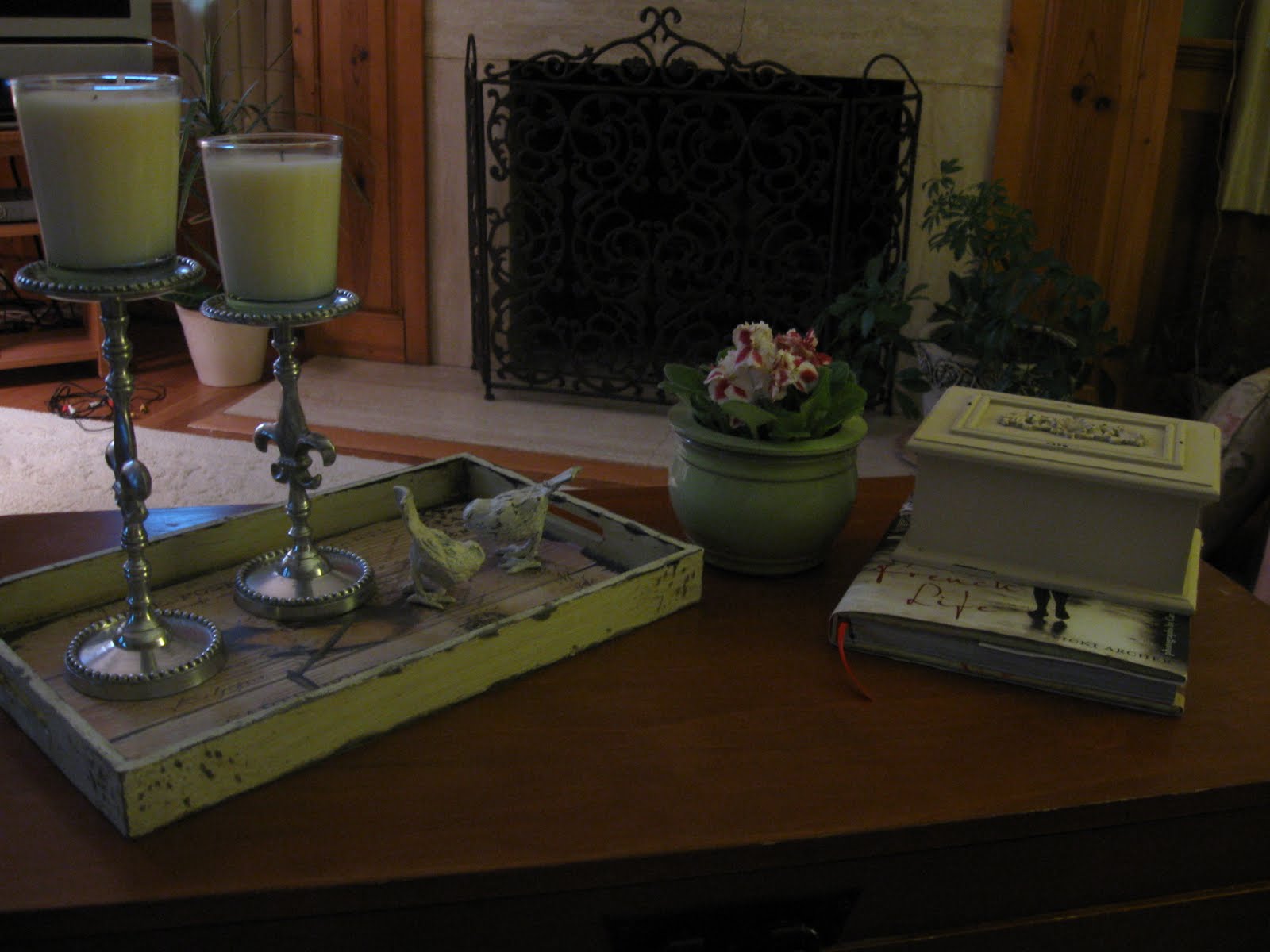 Today I am showing my coffee table in the living room. I recently ordered and received this little French wooden tray from Barb at French Elements. She has a really neat Etsy shops and sells all things wonderful and French. On the tray I have two Fleuer de Lis candle holders that you may have seen on my mantel before, and two little chippy white birds.You can see that we dressed Layla up in her Easter dress. Very springy, wouldn't you say? Of course she got it dirty the first time she went outside! The day wore her and Milo out.