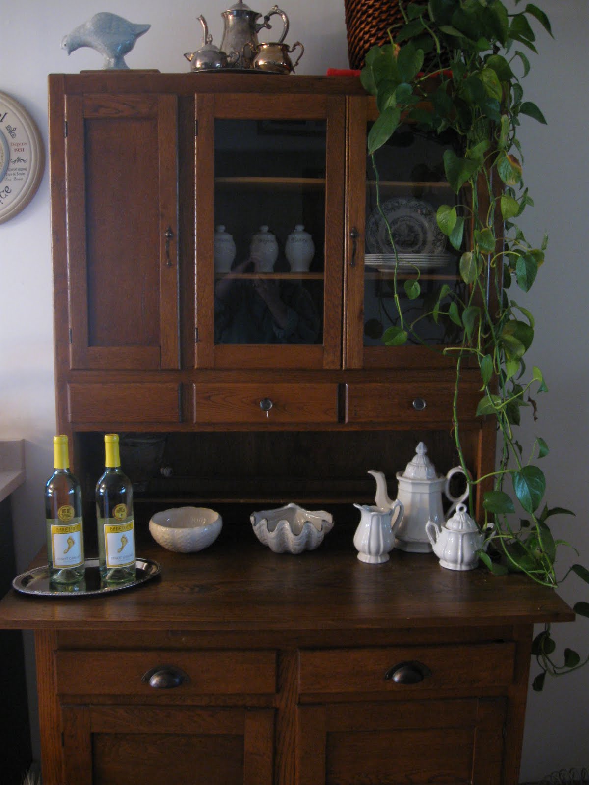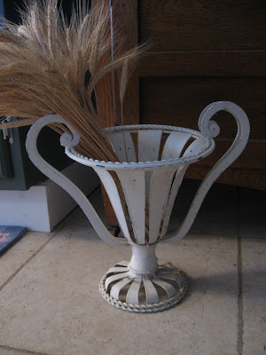 Above is a sweet little chippy urn that I usually plant with flowers in the summer for the patio, but I brought it in this winter and plopped a sheaf of wheat in it. I love the texture of it on the stone floor in my kitchen. Soon it will hold some pretty geraniums. Very soon. :-)
