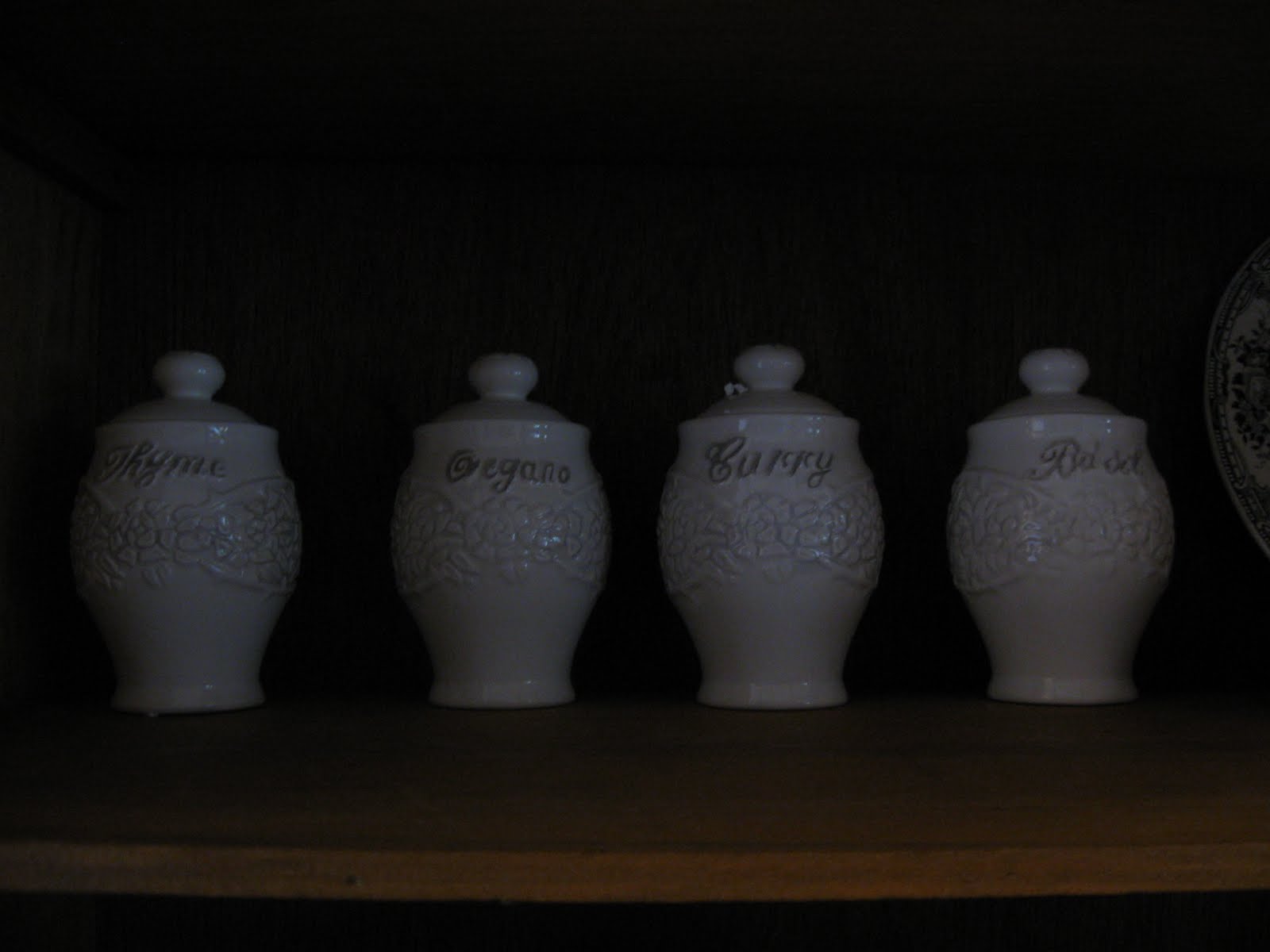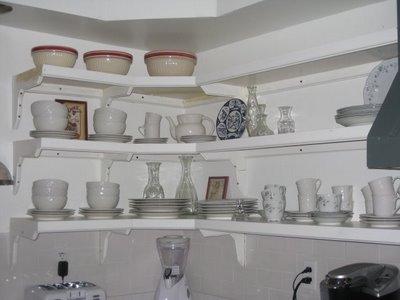 My everyday dishes are Basket Weave by Gibson. You can't see the cabinets below, but they are painted a greyish green called Painted Turtle by Behr.