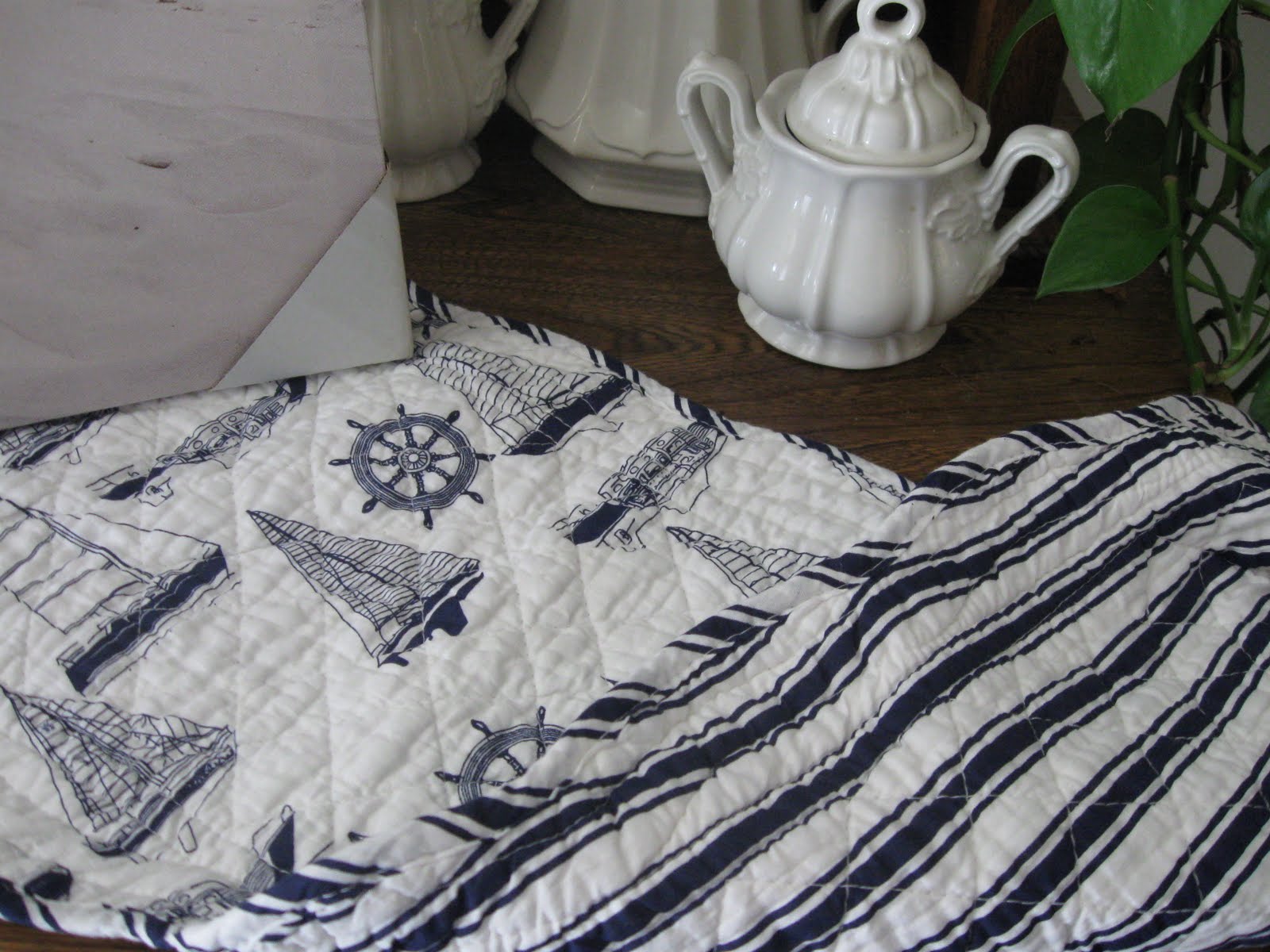 I also found this beautiful reversible runner. I have seen some coordinating napkins here in town that would be great inspiration for a tablescape. I bought some sand dollars and starfish to scatter about. I can almost smell the ocean. ;-D