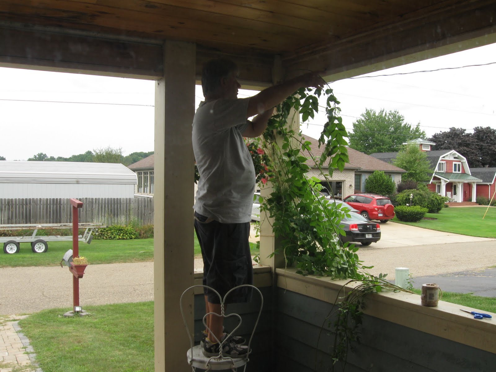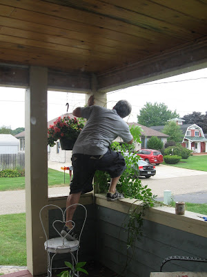You have to applaud The Husband here, diligently winding my wisteria up and around the front porch posts and tying the runners with neat little knots. They were actually on the ground and starting to wrap around the house. So my man, who is afraid of heights, began the climbing process to help the wisteria learn to climb on it's own, up the beams to the arbor on the 2nd floor balcony. What a guy.