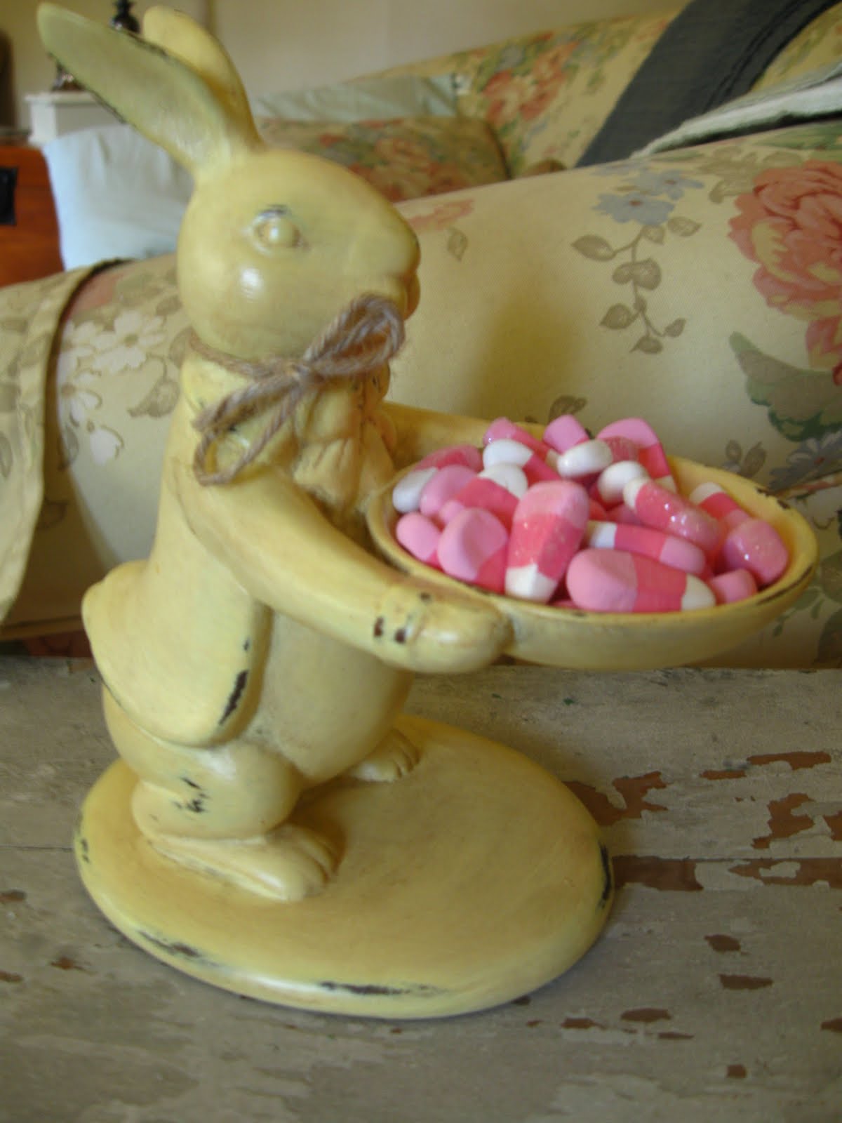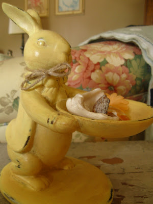 I lack creativity. I knew it the minute I posted the picture of the bunny with sea shells the week before fall began. And everyone was so sympathetic...just put a few leaves and acorns on the bunny's serving tray and it will look like fall. So I added some candy corn. Doesn't it look festive?
