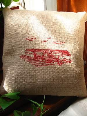 This is another pillow Barb made that I am going to bring to the lakehouse. I love the Adirondack chairs on the beach. And I love the look of burlap.