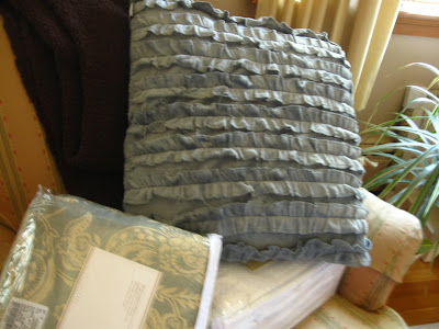 I was really thrilled at Marshall's when I came to the pillow aisle and saw this cute little ruffley guy that matches my new duvet so perfectly. No...I still haven't put it on my bed. The European shams are back ordered until December, but I have decided that I am going to get regular shams which are in stock. So I bought this throw pillow and a cream colored one. I hope it is not too matchy~matchy. My kids think I have gone nuts with pillows.