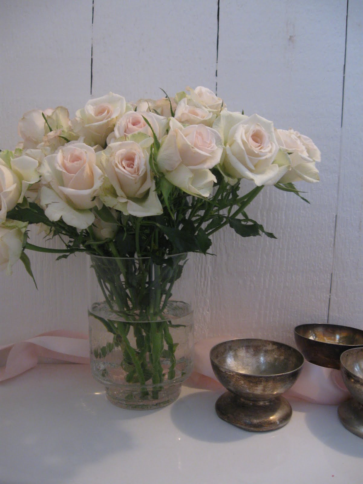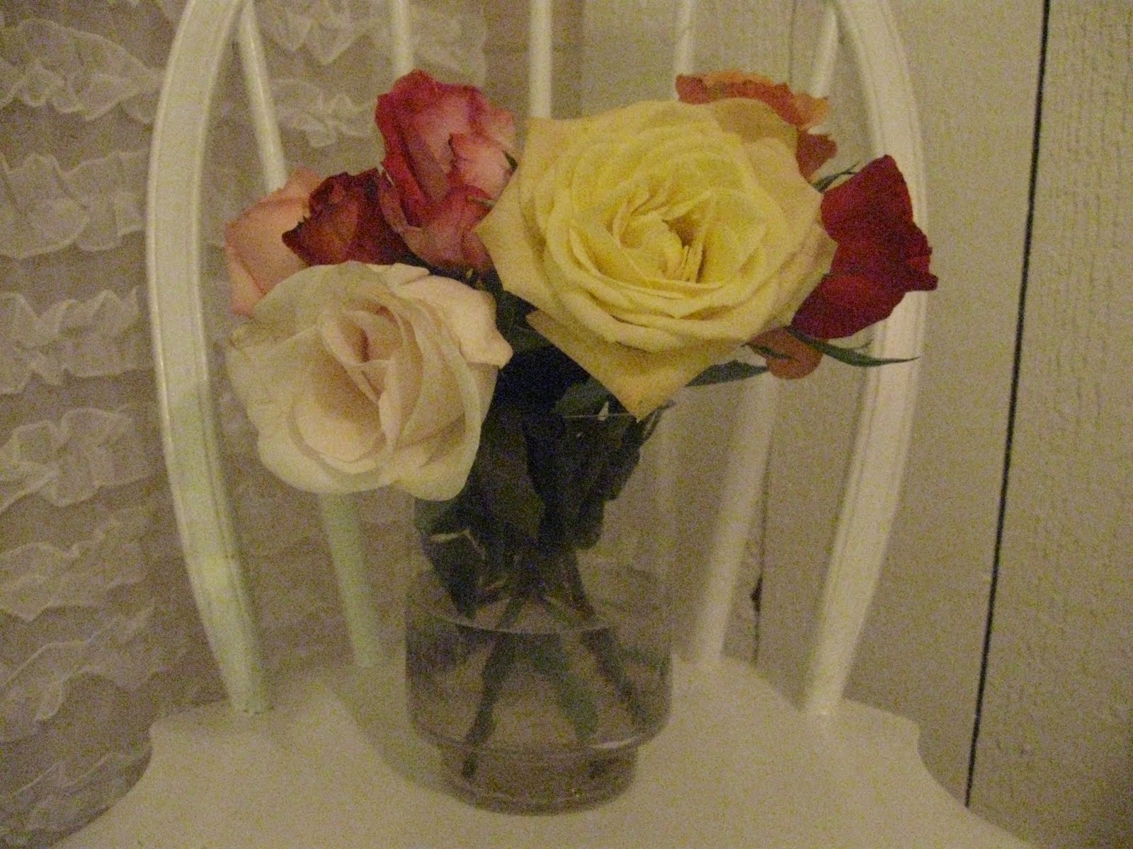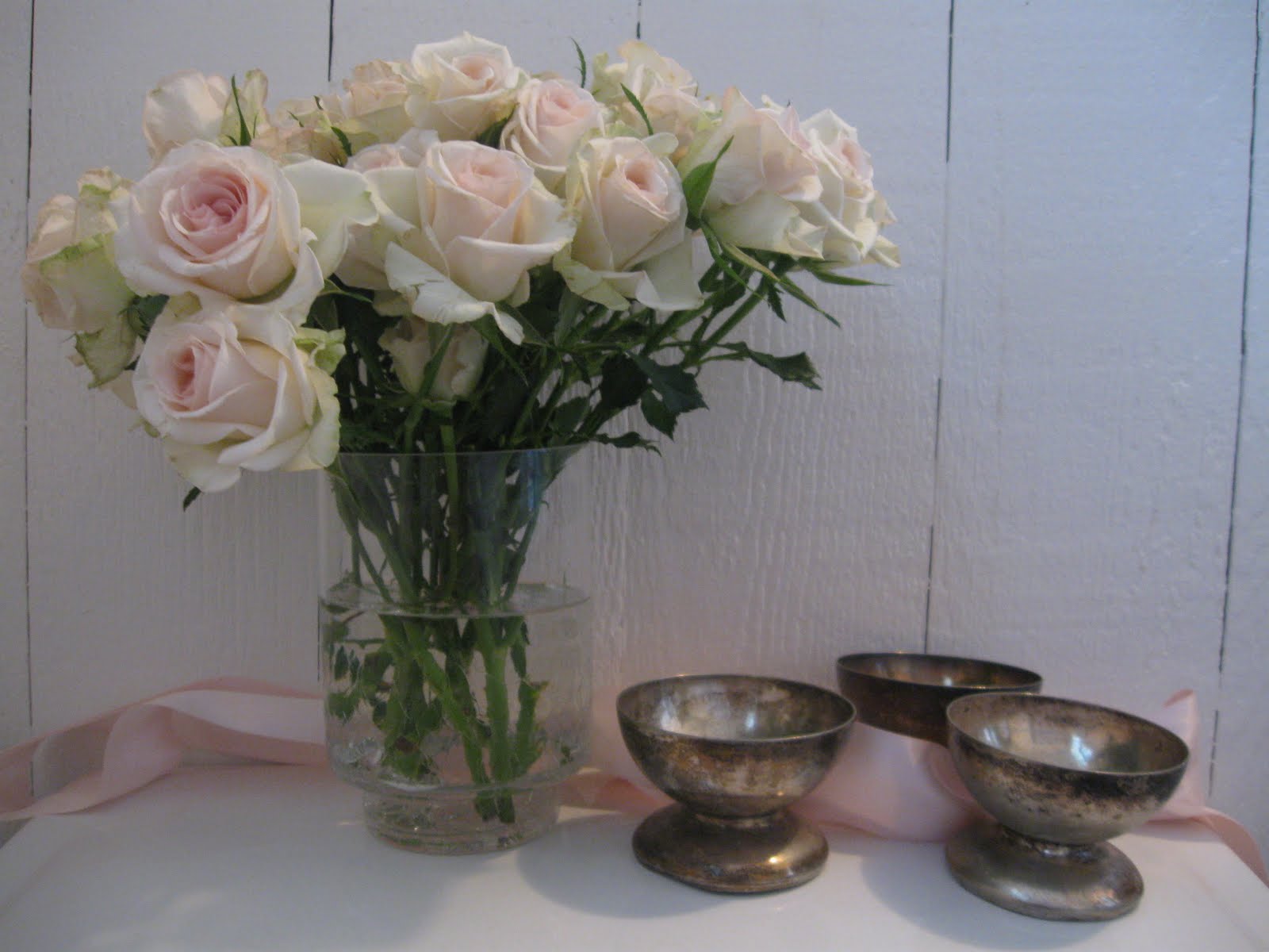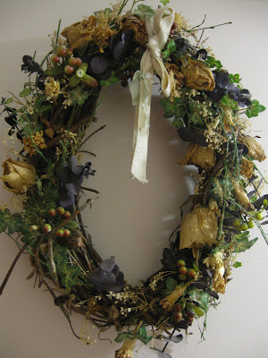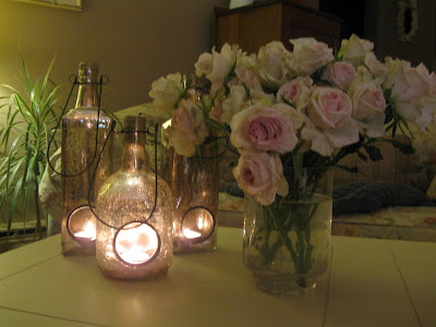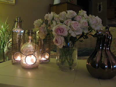Yesterday I went grocery shopping and picked up this bunch of spray roses, which were marked down. I love the blush color and they are so pretty to look at aside from all the browns and reds and golds of fall. I made a little vignette with some silver dessert cups that remind me that I have a ton of silver to finish polishing. Other than that, I think I am ready for Thanksgiving. I picked up my turkey yesterday {I have a big freezer downstairs}, and all of the trimmings. I also picked up ingredients for some baking, which I will start on and freeze. Each year we have a baking contest...the ladies bake and the men are the judges. No prize, just a lot of compliments. I haven't decided what to make, but over the years I have found that men love chocolate just as much as women and if it's combined with peanut butter, it's an even bigger hit. I'll let you know what I make.
