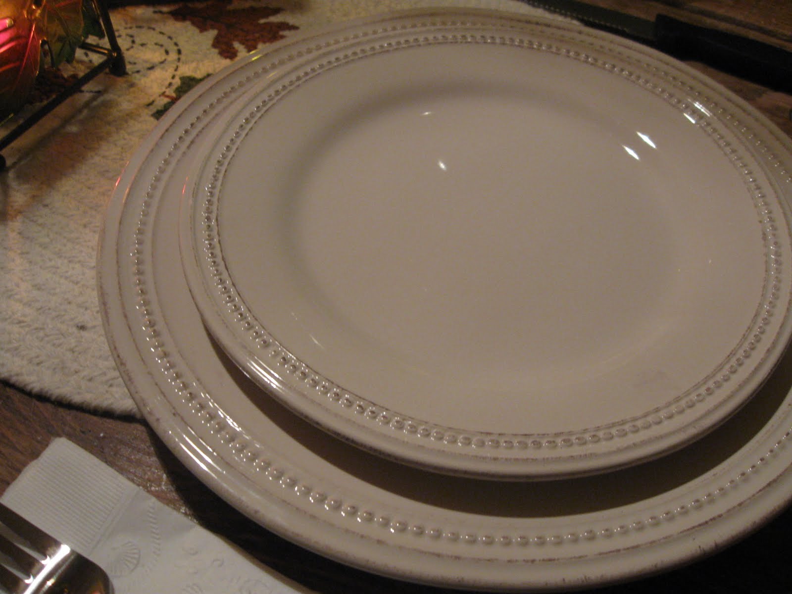It is called Antique Beaded Dinnerware. Each piece is hand finished and has a light glaze. I love the footed bowls and the beading around the edges. I have hinted that I want the serving bowl and platter for Christmas. Hey, a little hinting doesn't hurt.