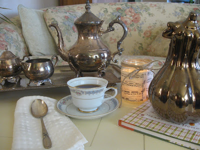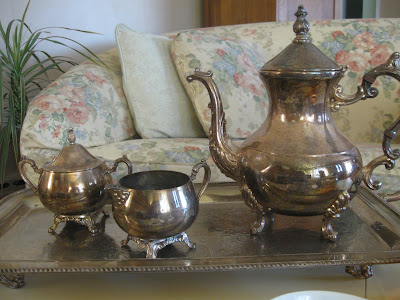 I set up a little tea this morning and I am joining Lady Katherine for the first time. You can visit her at Lady Katherine Tea Parlour for the party she hosts every Tuesday. Like the rest of you {most likely}, I've had some silver to polish for the holidays. Last year my son got up from the table and pulled out some flatware for himself because the silver was so tarnished. I was using a creamy type polish and it just wasn't cutting it, so I bought some liquid stuff that you have to use with gloves ...it sounds nasty. So I am not looking forward to this. Why I didn't do this sooner, I think I thrive on stress. But I digress. Last summer my friend Snow saw at lot of my silver up at the lakehouse on my hutch and said, "If you like silver, I have a ton of it and I hate to polish." That's all she had to say. A few days later she brought some pieces over and it included this tea set.