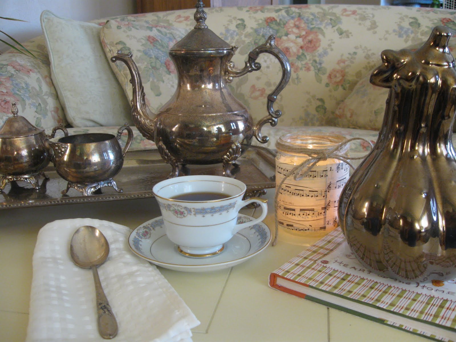 My tea cup and saucer are part of a set of china called Marquis that I found at an estate sale about 2 years ago. The silver spoon is part of a mismatched bunch. The thingie on the right is actually a mercury glass squash that I am using with my fall decor. It's hard to tell just what it is.