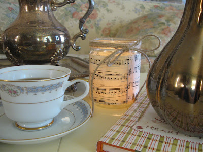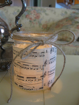 Yesterday I was fiddling around and trying to be crafty with some empty jars I have been saving. I took some sheet music and made a little candle holder which is in my first picture and the one above. I just wrapped it around a clean salsa jar and used some glue. Then I tied a little piece of jute around it and plopped a tea light in it. It pretty much cost me pennies. I'm looking forward to some extra time to make some more. I think they would look good grouped together or lined up in a row. I have been seeing similar {if not the same} candles around Blogland for quite some time. I was really inspired.