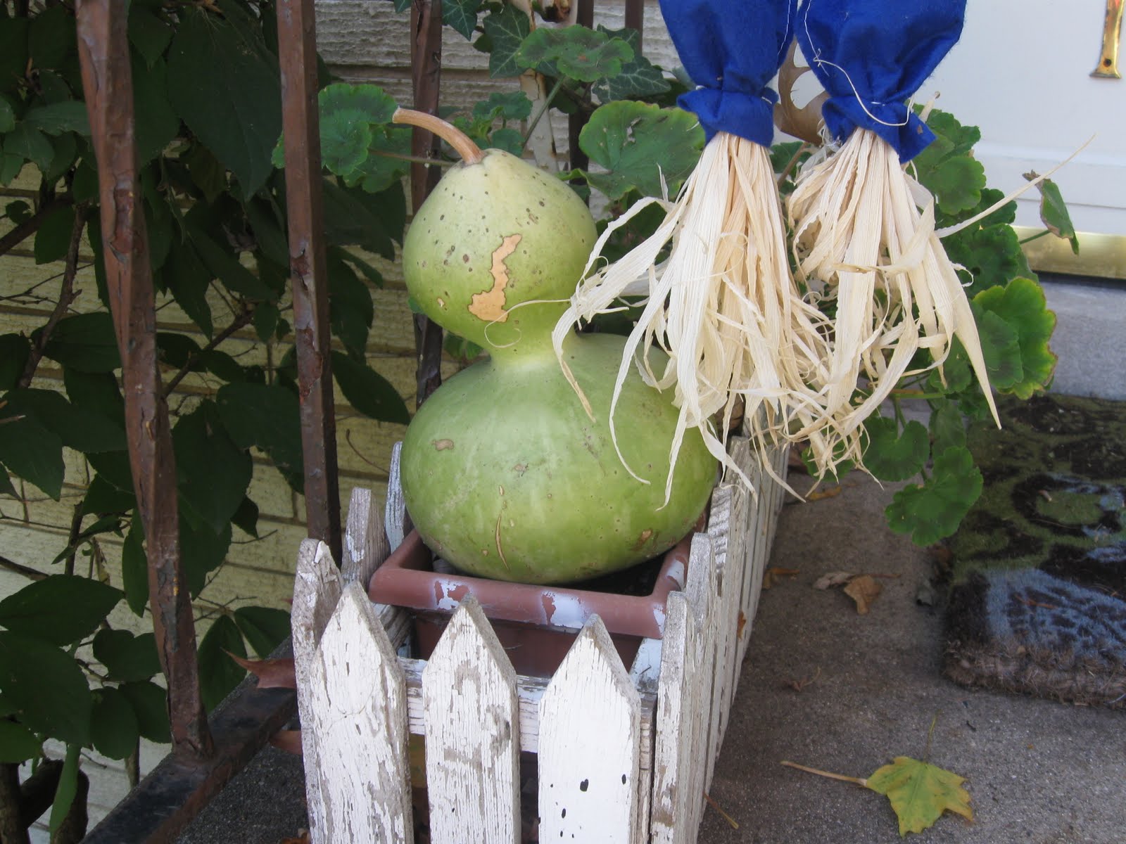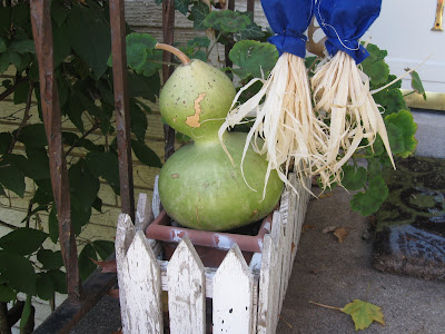 Yesterday was a beautiful day to get outside. The temperatures have been in the high 60's, which is strange because last week we were wearing winter coats and mittens. Go figure. I realized that I hadn't taken any outdoor pictures of my fall decor and I thought I'd share a little with you. I didn't do as much as I usually do because I wasn't up at the lake as much to buy the usual straw, pumpkins, gourds and other fun stuff. Having to pay Chicago prices, I kept it at a minimum.