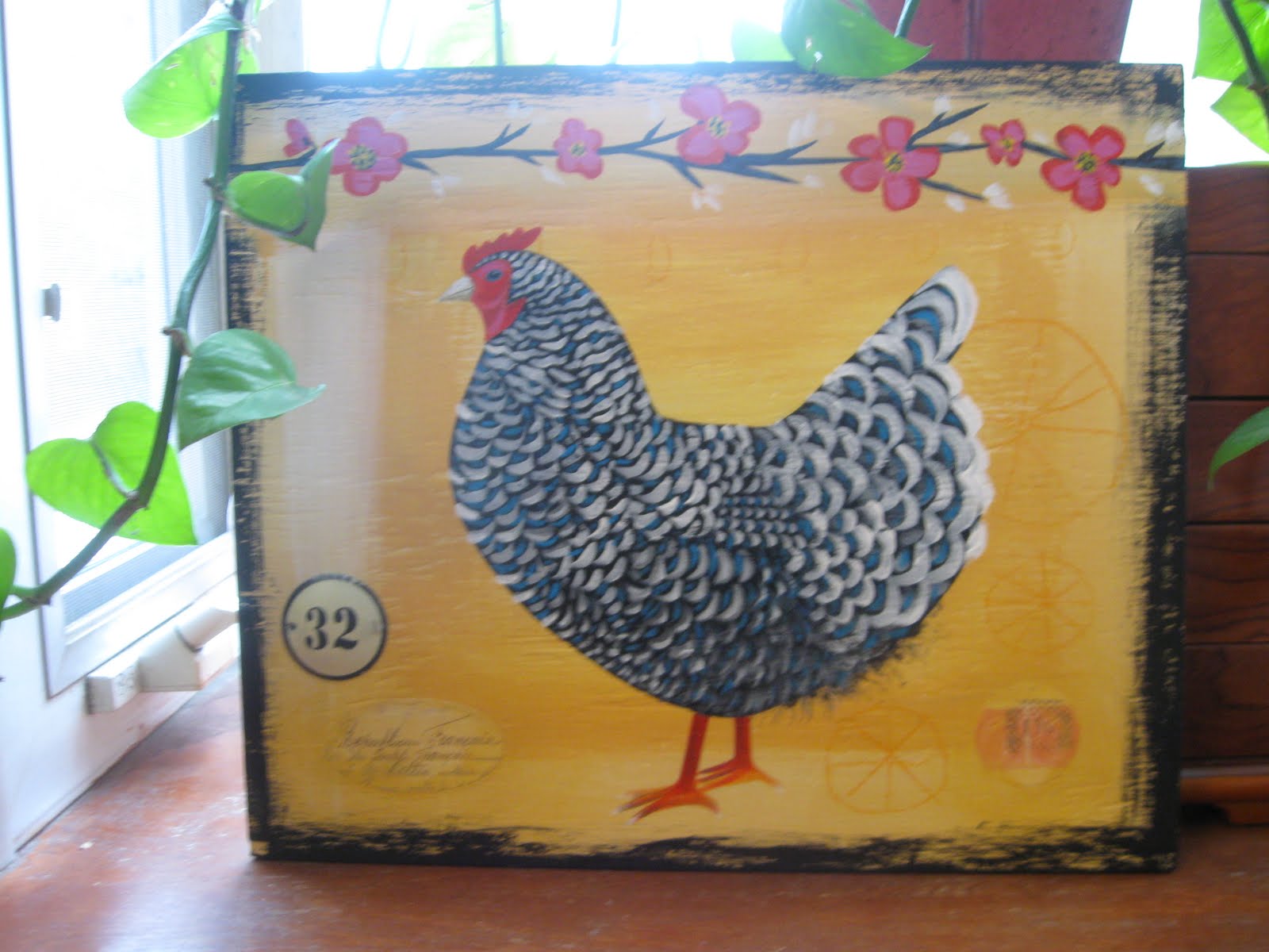 See the beautiful painting of the rooster? I won that on Sharon's giveaway. Her blog is My French Country Home, and if you haven't been there, you are one of the few. She shares her life in the gorgeous French countryside, you will love visiting. She had a weeks worth of giveaways and I won this painting by Ande Cook of Chickory. It's painted on a piece of wood, I love all the detail. I think it is going to look fantastic in my English Farmhouse kitchen at the lake. Thanks Sharon and Ande.