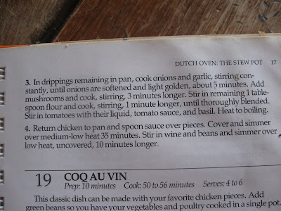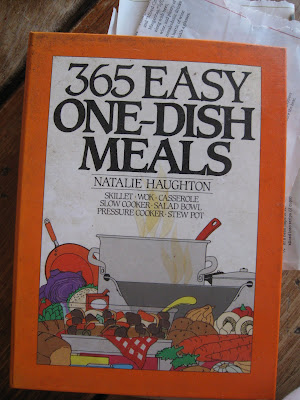 I was cooking again Friday night to meet up with Carmie's challenge of cooking a recipe a week from all of my dusty cookbooks. As you can see from the cover and pages of this book, it has been much loved. I bought it right after I had Abigail, as I was searching for quick meals and these are great because you get everything you need in one pot {or pan, crockpot, casserole...}.