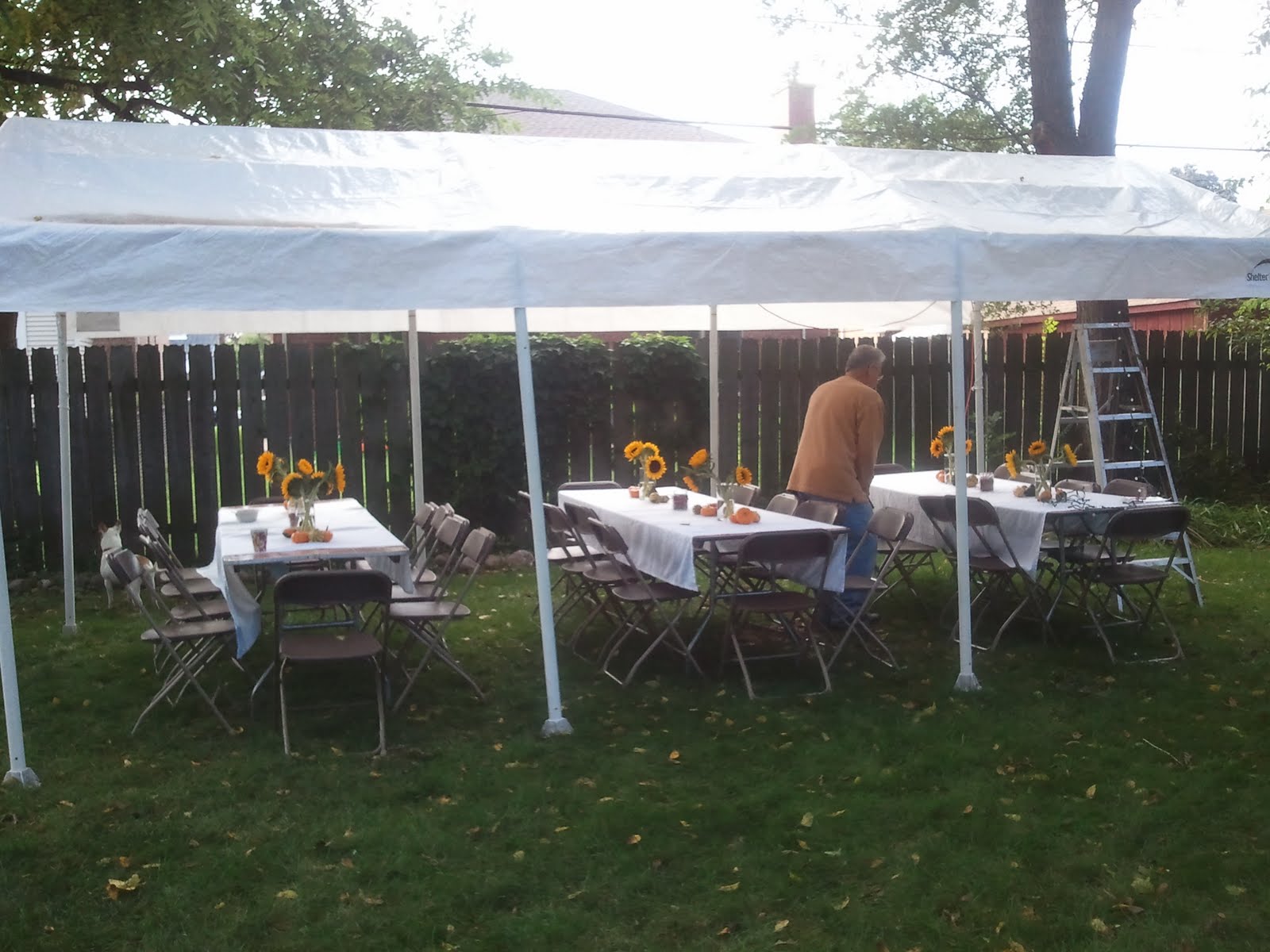 Saturday was a gorgeous day for a graduation party. It rained a bit in the morning and then it was sunny and hazy...that perfect sort of fall day. Emily {the graduate} had specific ideas for her party, a sunflower theme. We had three large tables under a tent and 2 big vases on each table along with assorted squash and gourds. I made the candle holders with empty salsa jars filled with beans and a tea light candle {as shown in my last post}. We had a lot of salsa left so that is what we munched on with plenty of chips.