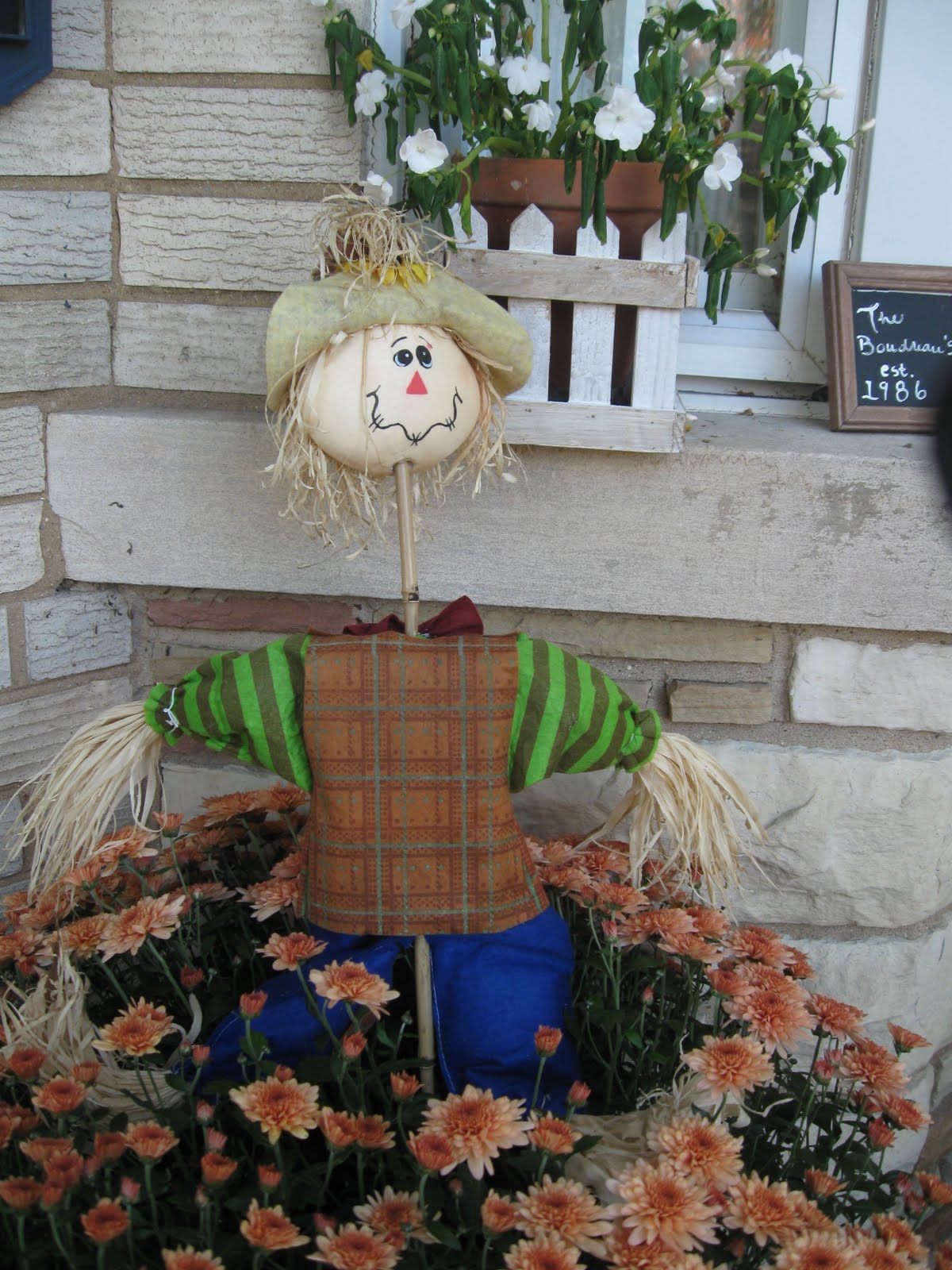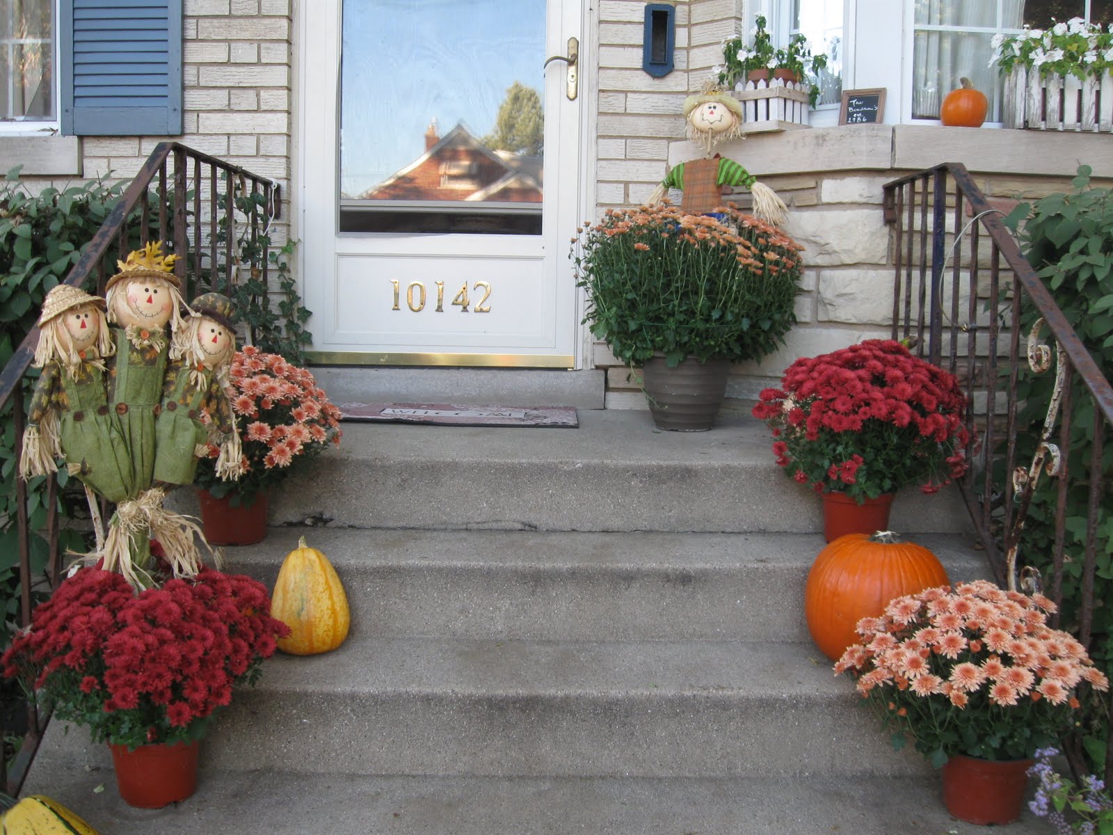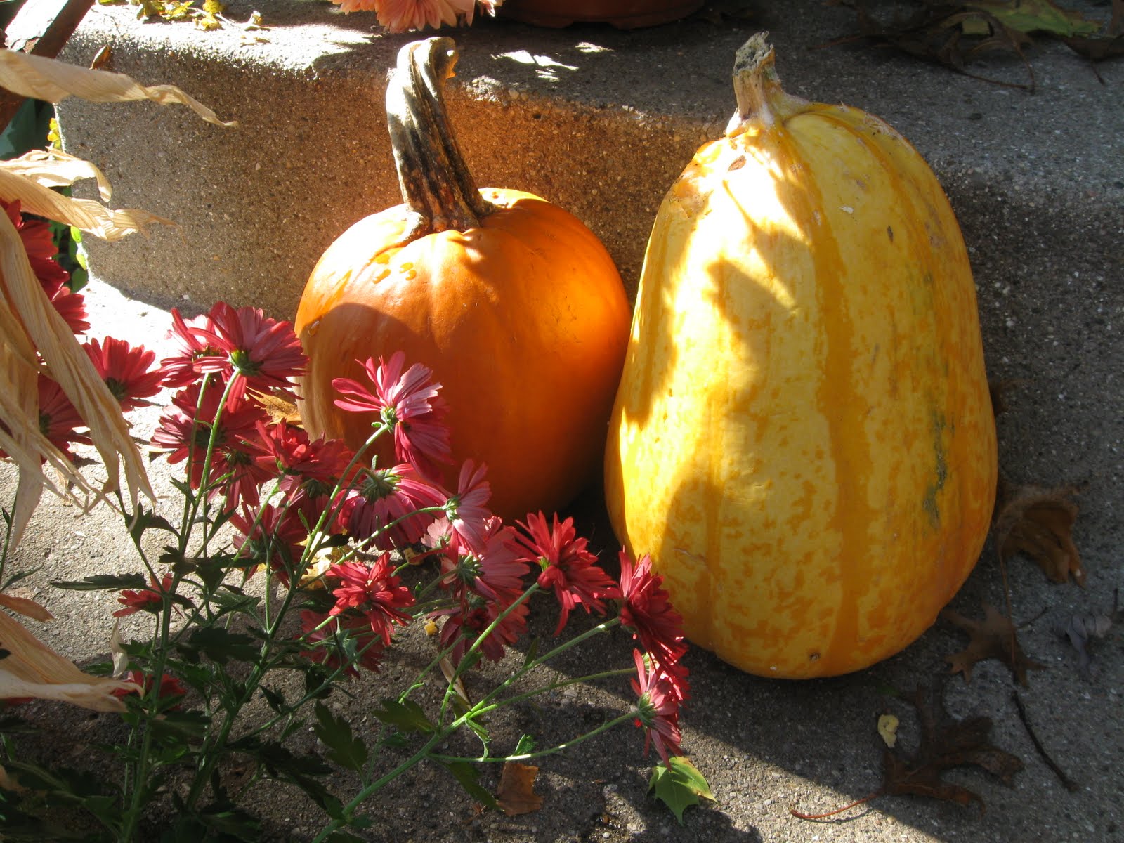 Here is what my porch looks like with all the annual flower pots gone and the mums and pumpkins and gourds out. Everything but the mums were bought in Michigan last weekend and they rolled around in my car for a week and some of the stems cracked off. I was worried that the squirrels would get to them and instead it was me.