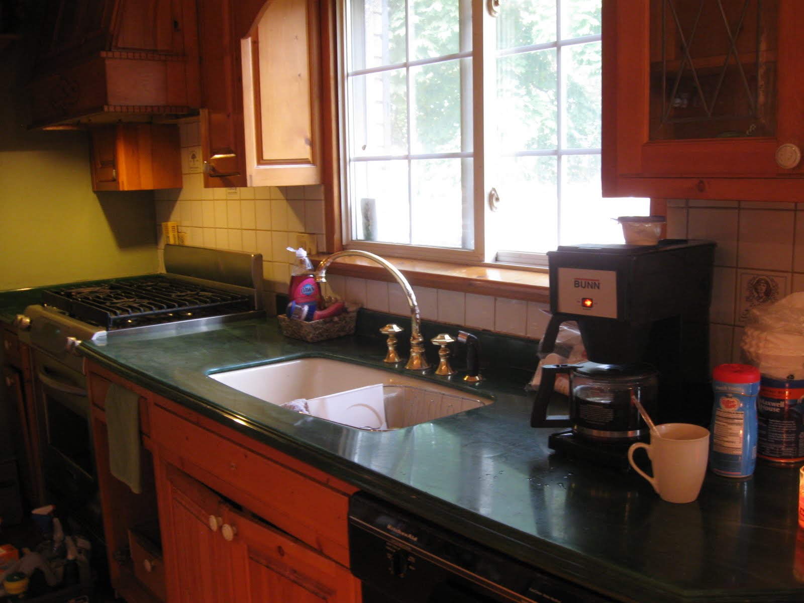 Oh Happy Day...the new counter tops are on, yet we still have so far to go. I took some before pictures. These are the old counters, they look like a green marble but they are actual a man made version similar to Corian. They were scratched and had some cracks and I was really sick of green. In this picture you can see the pine cabinets and white knobs. The fronts were taken off by the carpenter yesterday and he is repairing them as they were breaking off of their hinges. My counter look awfully bare here because I had spent 2 days taking everything out of the kitchen.