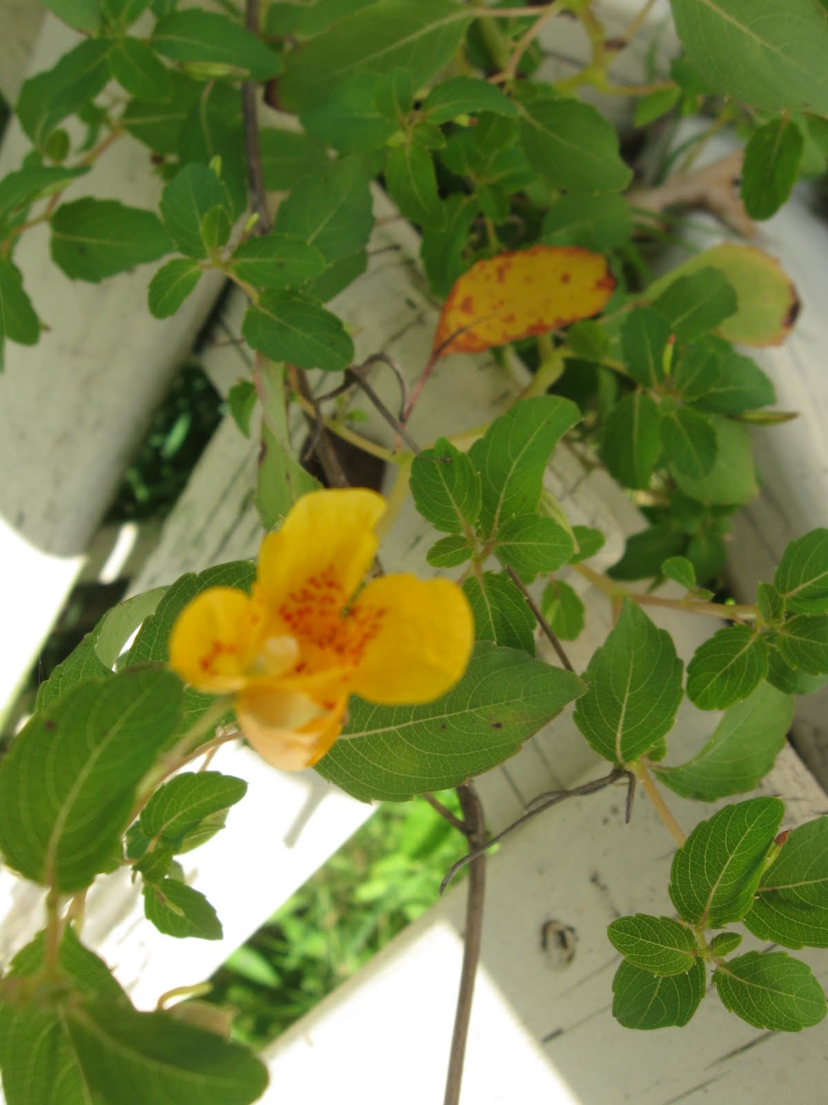 These little blooms were growing on the other side of the arbor and I don't remember planting anything like it. It's another climber. Does anyone recognize it?