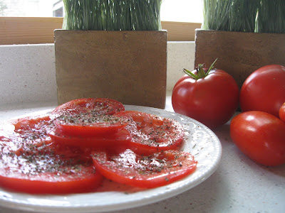 Tomatoes are still on the vine next door at my neighbor Susie's house and she is always kind enough to bring some over. Here I served them with olive oil and some dried Italian spices. Yum.