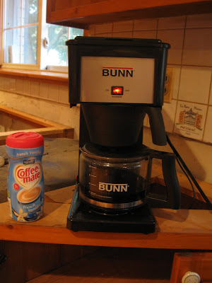 I survive on this most of the day. In between workers, I am going to slip out to the grocery store and buy things that we can keep in the fridge, that can be microwaved and eaten on a paper plate. All my food has been packed up and put in the den. All of my dishes, pots and pans, glassware, platters and a whole lot of other stuff have been relegated to the family room. We don't expect the cabinets to be done until sometime next week. Now, I have to pick out knobs and pulls. I am thinking of the brushed nickel cup shaped thingies I have at the lake. Any other suggestions of what you personally like or a place to shop for them? I was just going to mosy over to Home Depot.