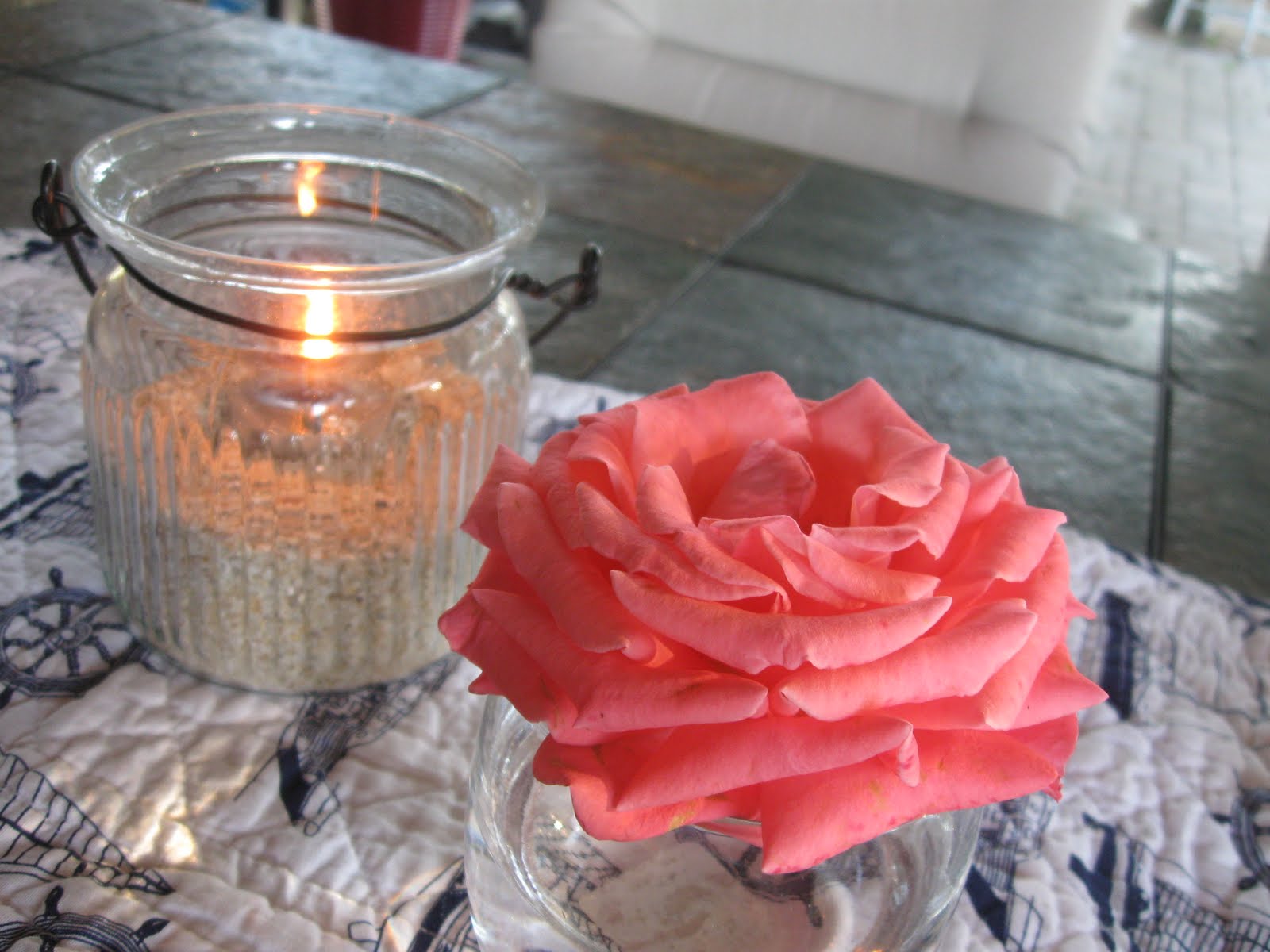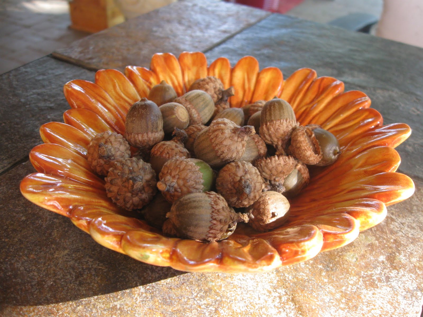 Roses blooming and acorns falling. I gathered some before The Husband swept the patio. The sweet guy also brought in all of the plants, including the palm trees and monster hibiscus. While the patio is looking empty, my house looks like a greenhouse. And can you believe I still have daisies blooming?