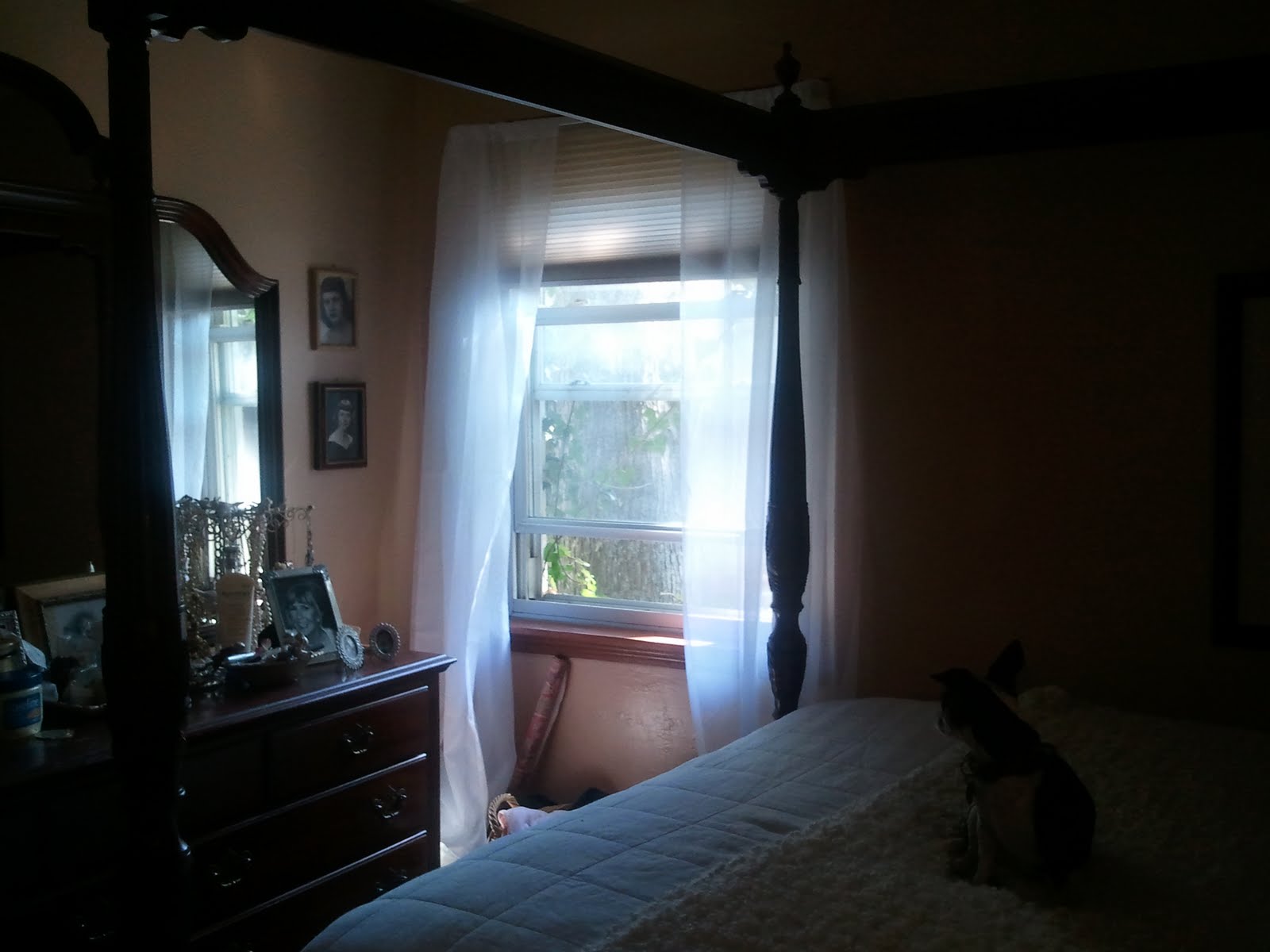 This is a poor shot, I'm still using my cell camera. You might remember my buying the sheer curtains from Target and forgetting 2 panels. I went ahead and put these up since the other window in my bedroom is a garden window and I'm just not sure how they will look. Anyway, I think they look nice {pardon the ivy growing on the screen}. The afternoon sun looks so nice coming in.