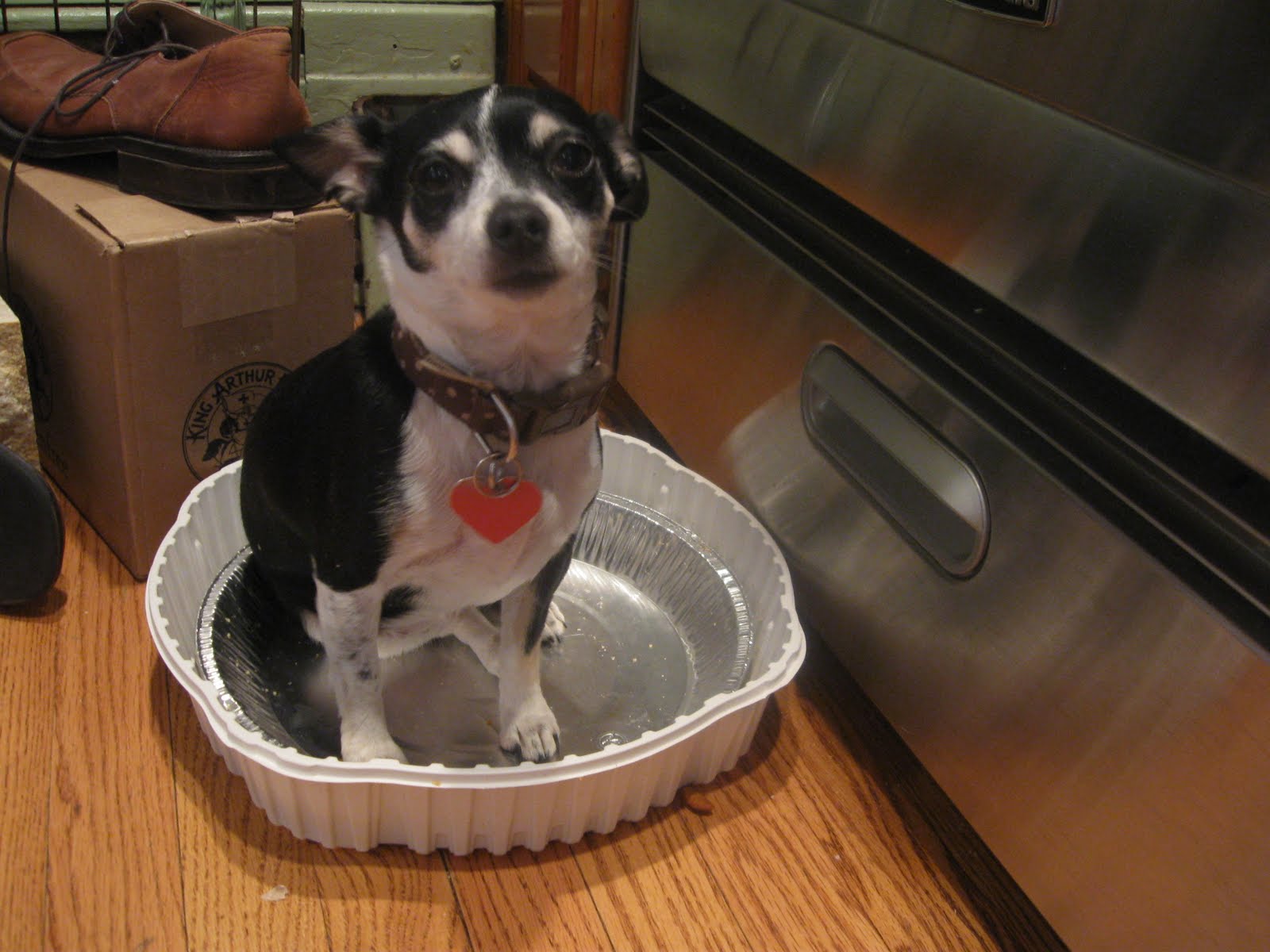 Of course the dogs knew it was a special day...Layla likes to lie in front of the hot oven to keep warm and smell the food. We found her curled up in this pie plate that missed the garbage can. It looks like a pretty dandy dog bed in the perfect spot.