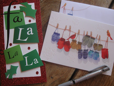 Time marches on and I have no tree as of yet. The Husband said he would take it under advisement. What was I thinking...that I could put up a live tree prior to December 1st and it would live to see the holiday? So I have been busying myself with other holiday duties...er, fun, such as writing out my Christmas cards and doing a little {lot} shopping. I have to say that I am 60% finished and I am going to start wrapping gifts today. I didn't go out on Black Friday, but I did take advantage of Cyber Monday. When there is free shipping, you just can't beat shopping online. I know this makes me sound like an efficient little elf, but believe me, after a week or two of the boxes arriving, begging to be wrestled open and wrapped, I start to lag behind and I'm up on Christmas Eve to all hours wrapping. All my ideas for handmade gift tags and stamped paper fly right out the window.