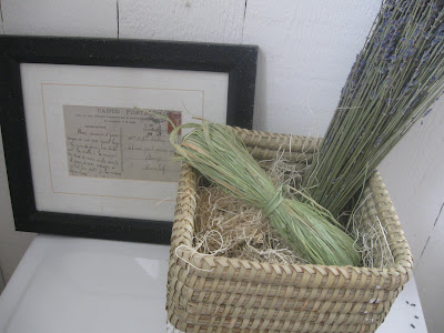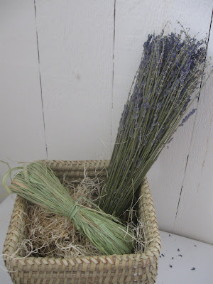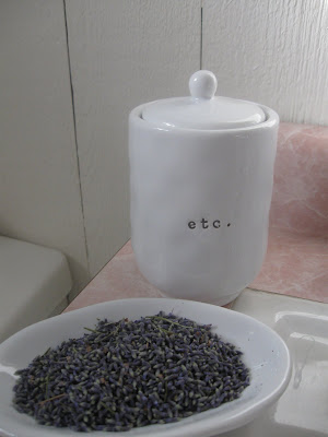 The thing about dried lavender is that the buds fall off the stems. Never fear, into a porcelain soap dish and into the bathroom they went.
