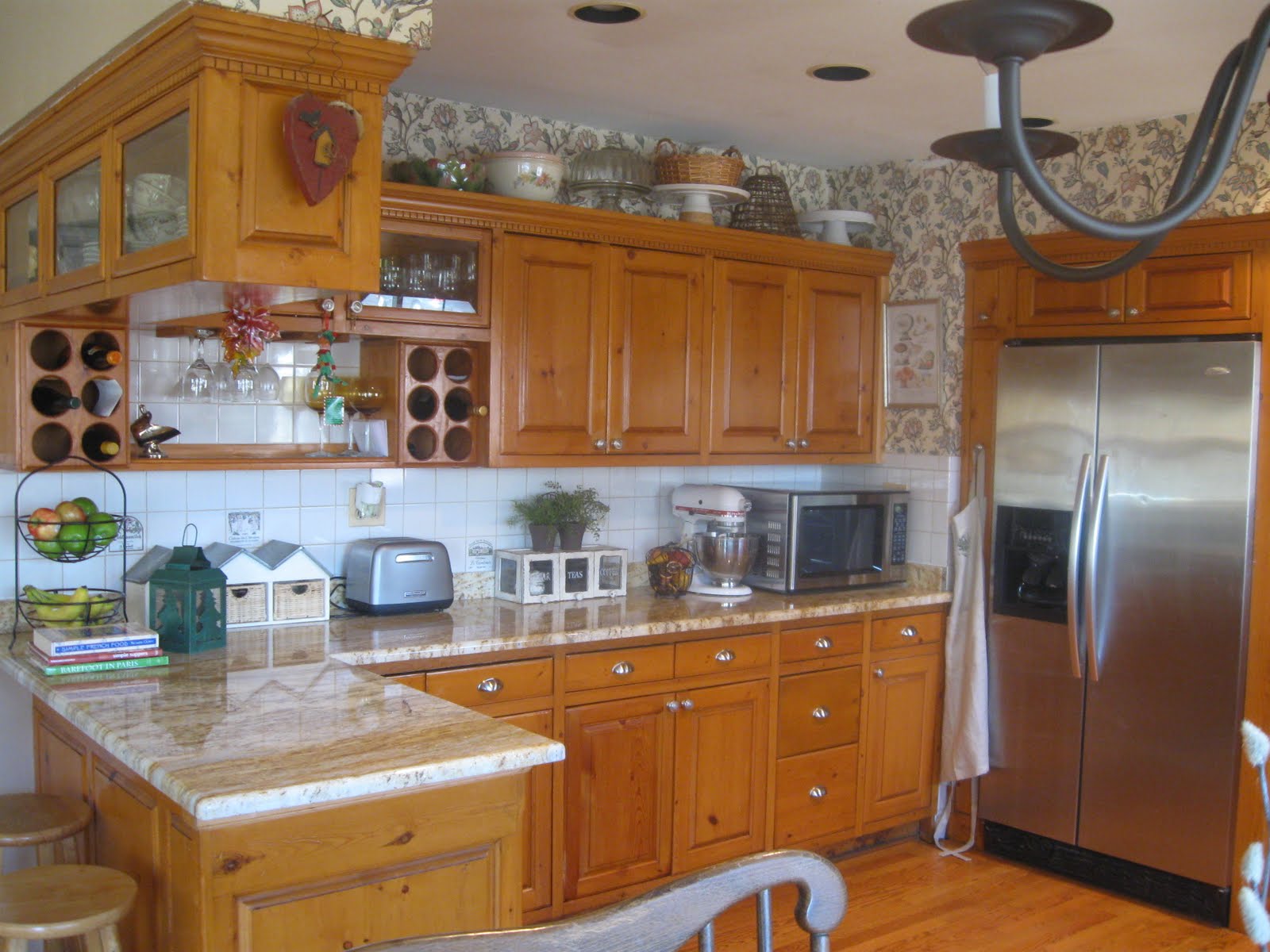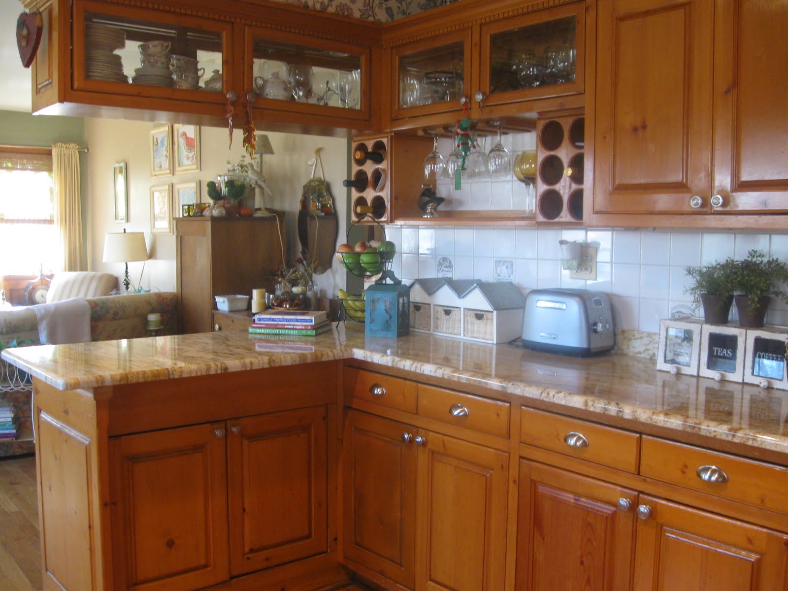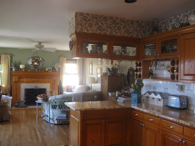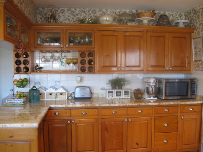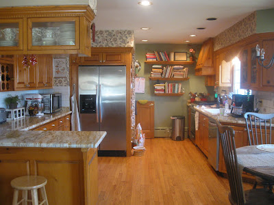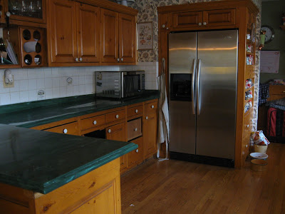 ...and this was it 4 weeks ago. We kept the original cabinets as you know, but had them taken off and revarnished and new hinges put on. New granite counter tops replaced these green things that I had for 20 years.