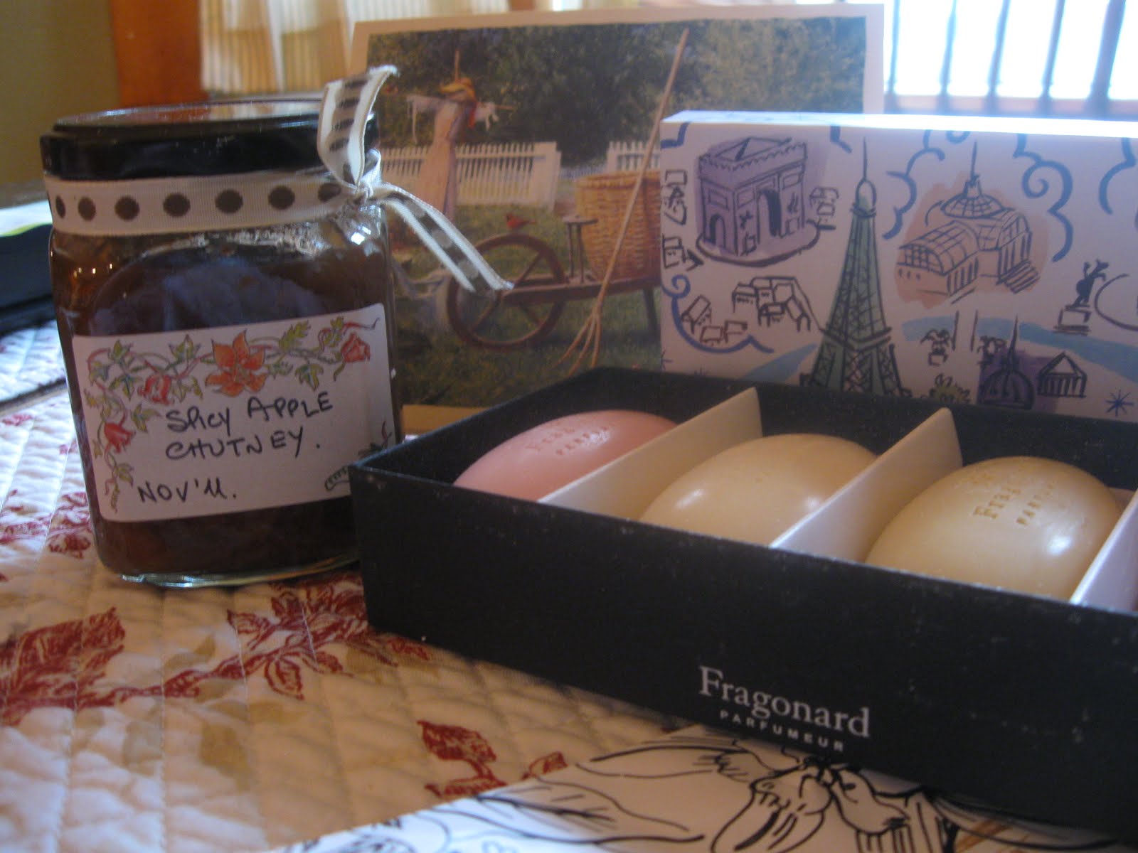 First up, I received the most wonderful gift in the mail yesterday from Maggie of Normandy Life. Many of you know her and I am one of the lucky ones. She did a post on making chutney a few weeks ago, and I commented that I had no idea where to start and had never tasted it before. She kindly emailed me and asked if I would like her to send me a jar from her homemade stash. Of course! So it winged it's way from France to here and I am the lucky recipient of not only a jar of Spicy Apple Chutney, but she included a sweet card, a little tote bag and a box of deliciously fragrant soaps that she bought in Paris! Is she not the best? I can't wait to try the chutney. She advised me that it is good along side cold cuts and meats and also cheeses, some of which she recommended. I am so touched and thankful to have such a sweet and generous person like Maggie in my life.