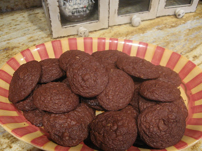 I had a very quiet day at home and decided to do a little baking. Nothing for the holidays yet, just some goodies for taste testing. Only the best makes it to the holiday table. And I have some seasoned judges. Tomorrow I am going to start to bake and freeze. First up are some heavenly chocolate cookies that get help from a brownie mix. I got this recipe from Cass at That Old House. Give her a visit, she has a lovely blog and such a great sense of humor...you will love her. Anyway, she wrote about a cookie she likes to make and all you do is take a regular brownie mix, add 2 eggs and 1/4 cup of oil and mix. She added chocolate chips, I added walnut pieces, and your good to go. Bake at 350 degrees for 8 minutes. They taste like brownies! And oh! So easy!