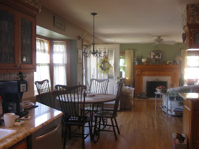 This looks from the sink area to the dining area and the living room beyond. The fireplace was made by the same carpenter that did the cabinets, all in pine. It looks like a lot of wood but I just tossed the big cream colored area rug I had in the living room and have something else ordered. It looks a lot cozier with the rug.