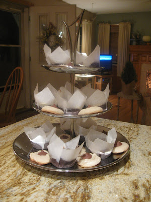 I made shortbread cookies with a chocolate center and chocolate cupcakes filled with a cream cheese mixture. I found this three tiered stand at a thrift shop last summer for $3.00.