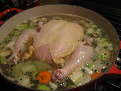 I cooked the chicken until I could pull the meat off the bone and then I threw the carcass back in the broth to cook 6 more hours. After refrigerating it overnight, I skimmed the fat off and I now have a nice, deep colored broth. Tonight I am going to make soup! I have all sorts of root vegetables and mushrooms and some Amish noodles. That should clear my head out!