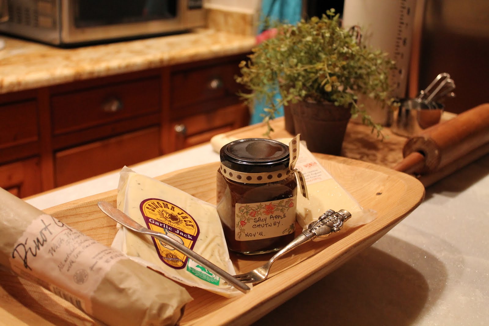 I thought when The Husband came up for air, we would have a nice snack, including Maggie's chutney. You might remember that she sent this to me last month as a sweet little gift, as I had never had chutney before. I am looking forward to trying it today.