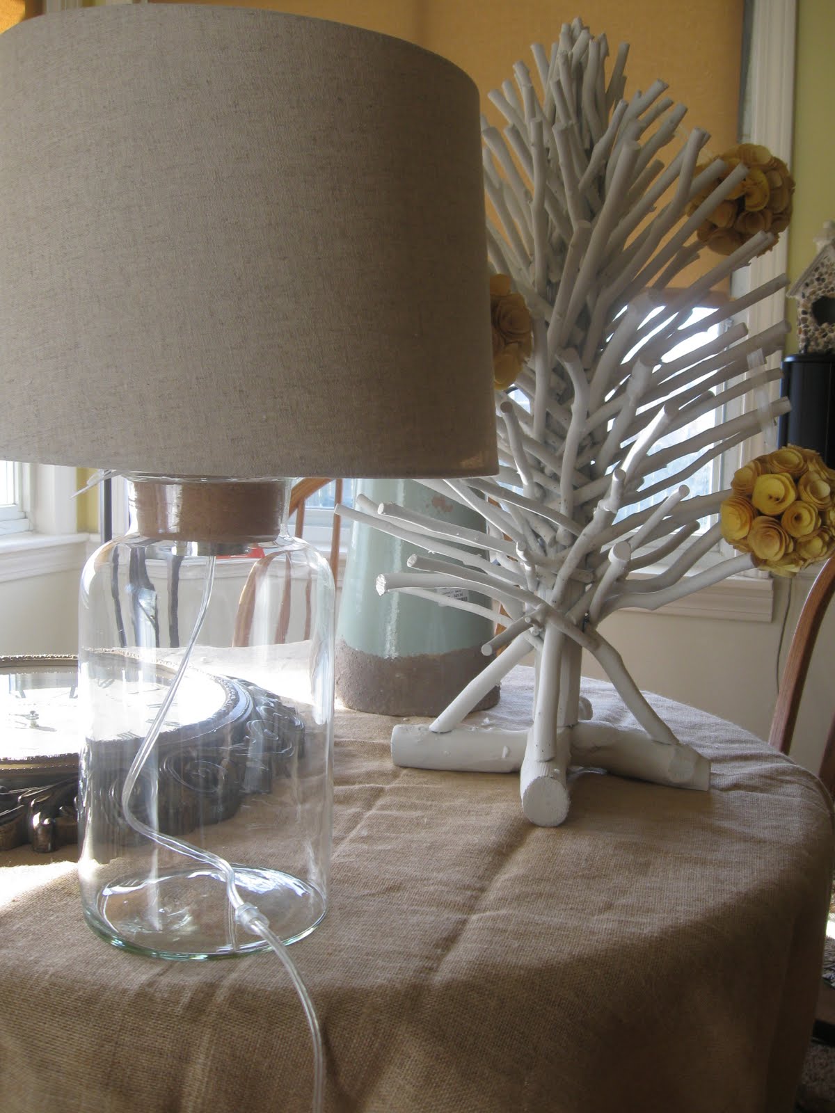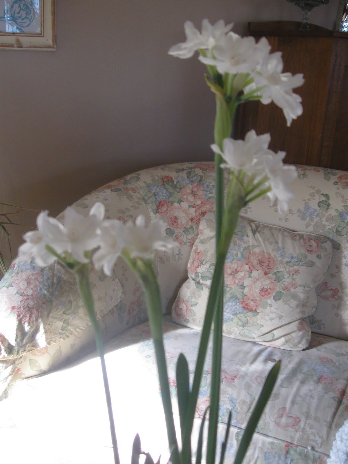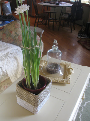 Isn't it wonderful? It's made out of real branches and I got it for a steal. I'm not sure what I am going to do with it, decorate it for the seasons would be one idea. Anyway, this is a fun way to star the new year and I am enjoying the process of doing the room. Have you De~Christmasized your home yet? Last night my sweet little girl went to town taking down all the decorations and packing away bin after bin. Then she and The Husband took the lights off the tree and put it at the curb where the big chipper truck had at it this morning. Goodbye Christmas. It feels different to have the house back to normal. It looks a lot less cluttered but I do miss those colored lights. On a good note though, my paperwhites bloomed! They look so pretty, I should have included a picture.