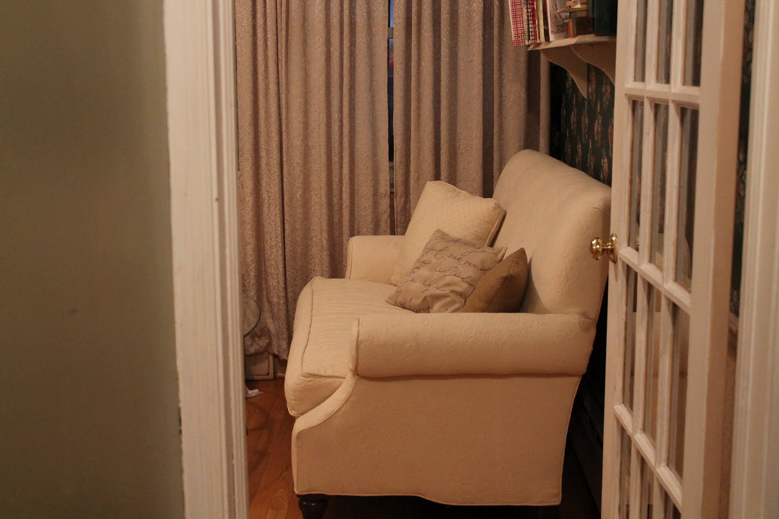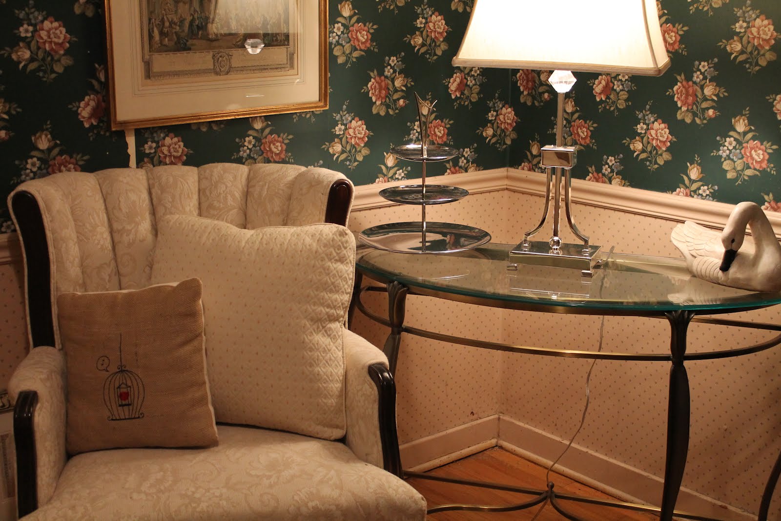 This was one of the tables we moved to the den. It is a little too elegant for the look I am going after. I have been wanting to take down this wallpaper but The Husband says it is the one thing in this house I can't change. Is wallpaper supposed to be making a comeback?