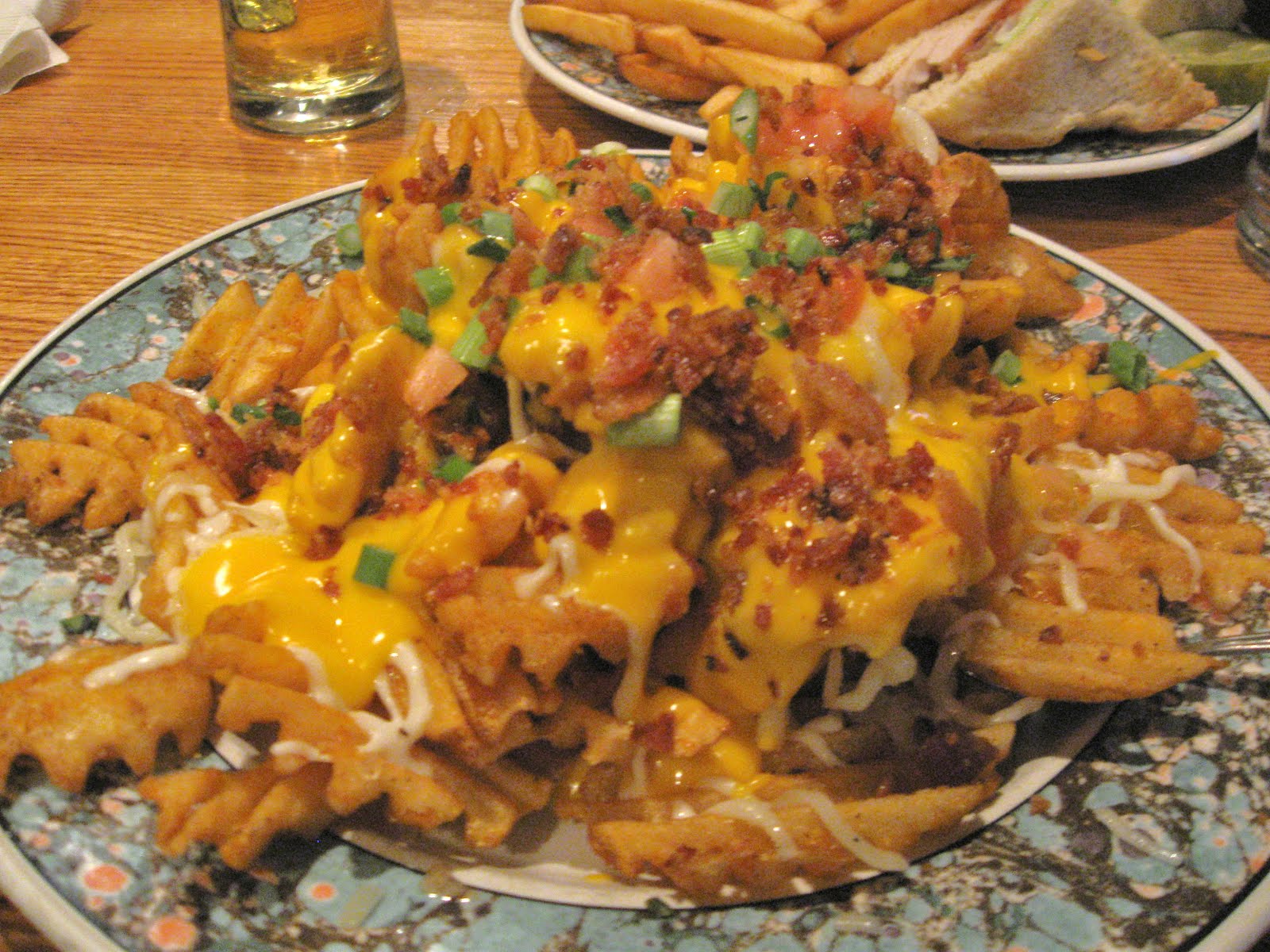Last week I had the whole family over for dinner. Have you ever heard of Irish nachos? I ordered them at our favorite pub a few weeks ago and took a picture. I then replicated it as an appetizer before our dinner Thursday. In a nutshell, you make waffle fries and then sprinkle chopped green onions and tomatoes over them, then top them with the cheese that you buy in the jar. Do not use shredded cheese, it turns to glue! I mound everything on a festive plate before I pour the hot cheese on. You can then garnish them with more green onions or even bacon bits as they did in the restaurant. Yum!