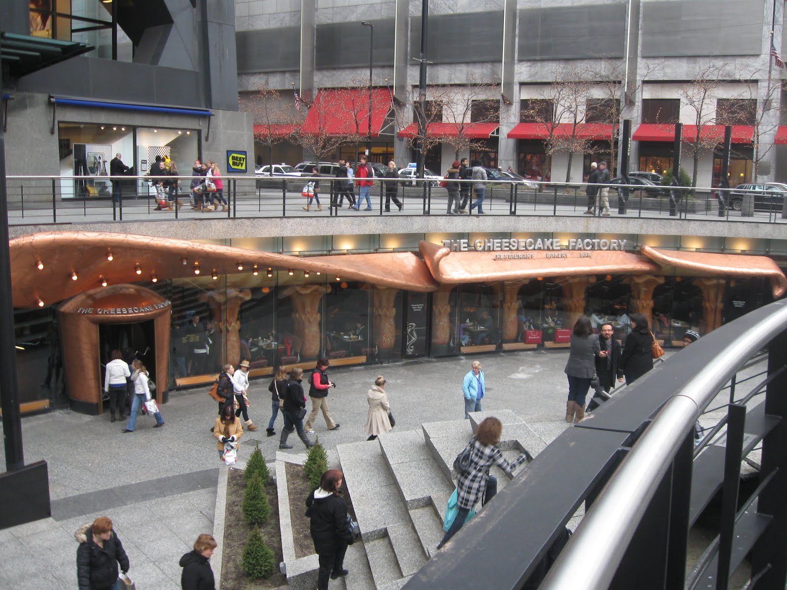 In the basement...not the bottom floor, the basement of the John Hancock is the Cheesecake Factory. It is made to look like you are inside a piece of cheesecake and I have found it to be very claustrophobic. The cave~like atmosphere and the fact that there are 98 floors on top of you!