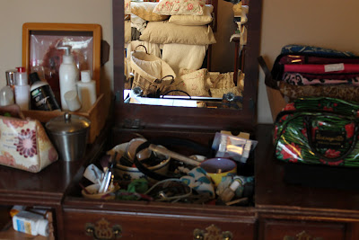 Ignore that reflection in the mirror of all my pillows and quilts piled up, I am reorganizing that, too. And I am reorganizing this vanity. And I will show you the results in an upcoming post.