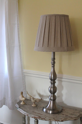 I found this lamp at Homegoods and have it on an old chippy table I had. This is next to the corner chair and is a perfect place to curl up and read. To the right you can see the curtains that I found at JC Penney's. They are simple white linen panels and super inexpensive.