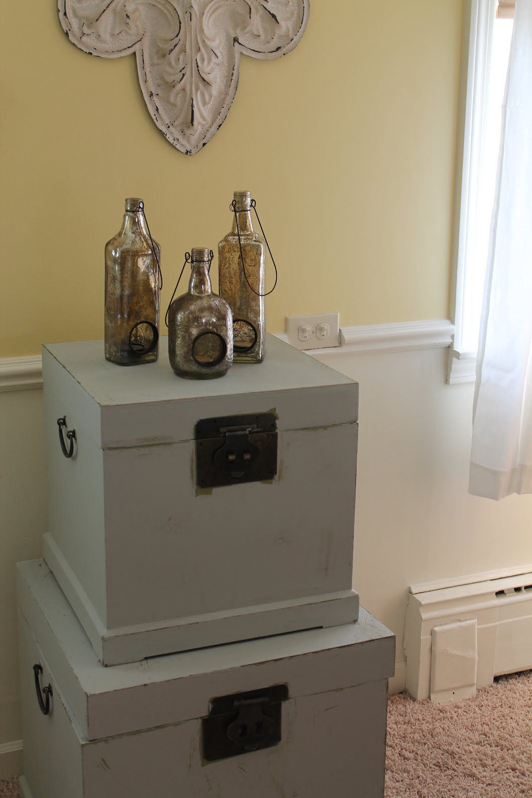 Other than one small wall, I am pretty sure the family room is completed. These are the little chests I showed you in my last post. They were a lime green and now they are a pale dove gray. I have a lot of extra pillows stored in them.