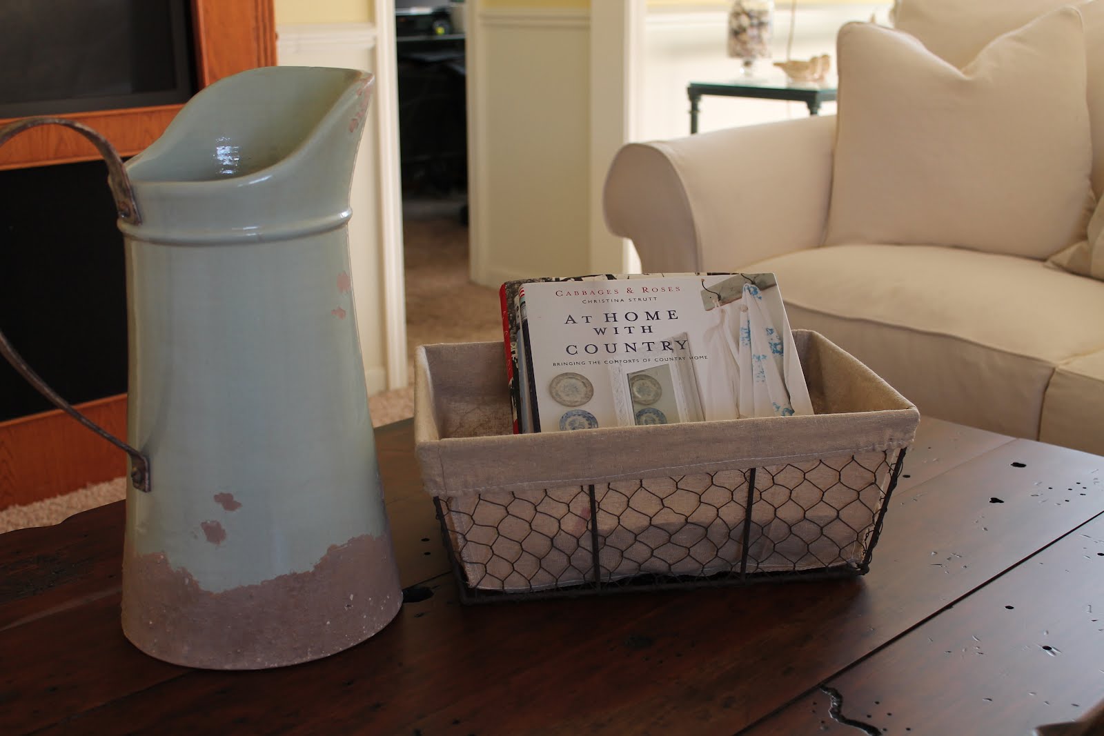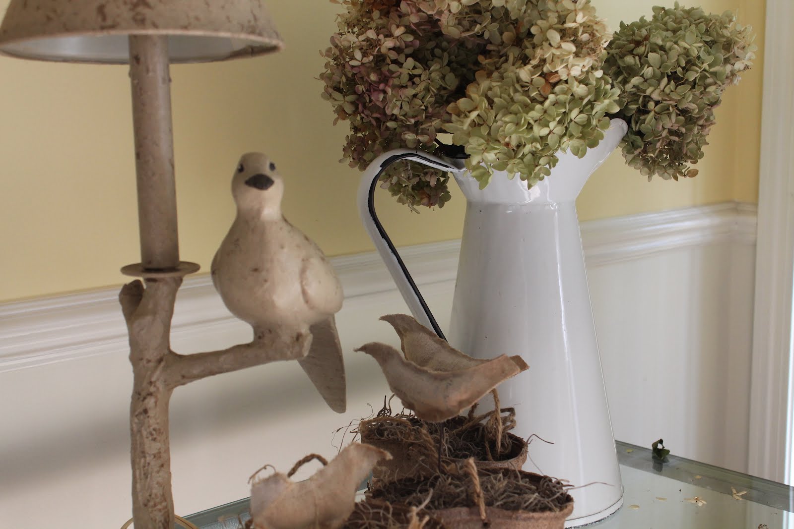And here they are, on the sofa table! This pitcher is very much like the one on the coffee table, just smaller. And I have some of my favorite birds scattered around.