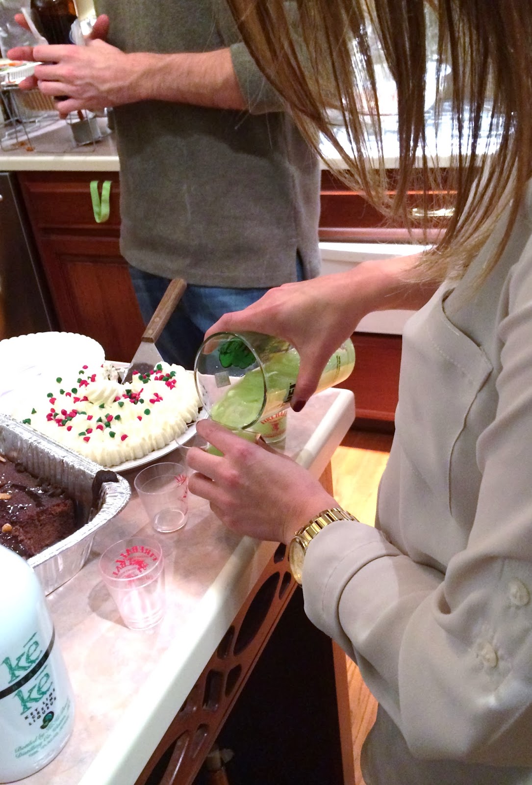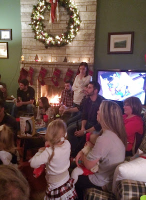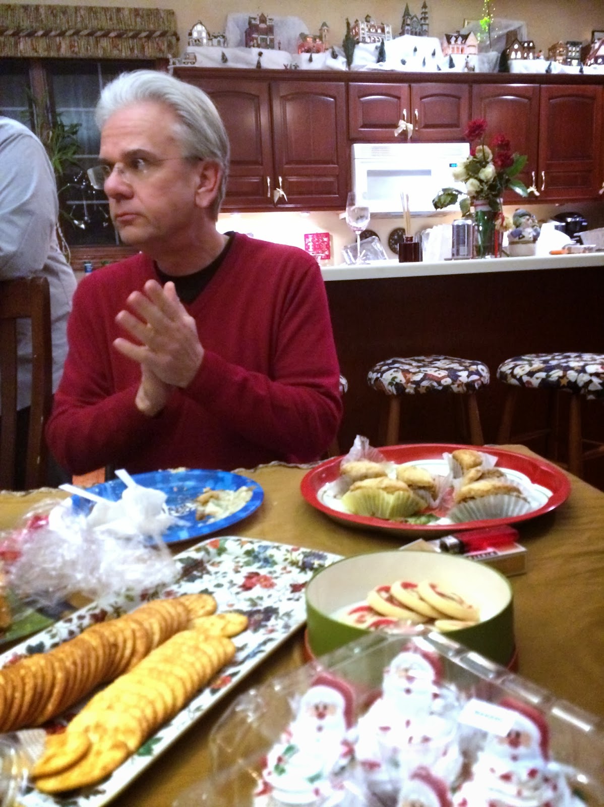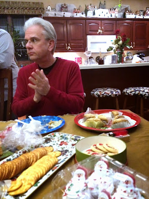 Brunch wrapped up about 1:00, and then The Husband and I joined Kevin and MC at her sister's home with her whole family, all of whom we love. Abby and her boyfriend, Tom were also there. Emily and Jeffrey had other plans. Katie does a beautiful dinner of fillets, mashed potatoes, asparagus, homemade rolls and plenty of beautiful desserts. We had such a great time, although this is about when my back started going to hell. :(
