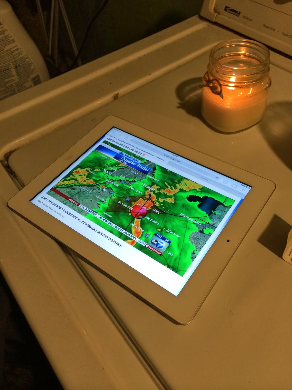 I suppose some of you have heard of the storms and the tornado they spawned in Illinois this past Sunday. I thought it was very odd that it was so warm outside when I got up that morning. It was like an August day with bad weather coming. And sure enough, by 11:00, the local news was breaking in on the television shows to tell us that a tornado was on the ground just north of central Illinois and from the Stormtracker, it was heading right in our direction. I really didn't think much because it was so far off and anything could cause it to die out or go in another direction. But it was coming on a straight path, not leaving the ground, at 65 miles an hour. In the meantime there were all sorts of storms around us. The wind was gusting and the rain made everything around us invisible. The Husband had started watching the Bears game and when they took the players off the field and started evacuating the stands, he decided we should set up camp downstairs. So he, Abby and I grabbed flashlights, candles, our phones and her IPad and sat in the laundry room. My first worry was Emily, who was at work She, too, was in the path just southwest of us. The Husband didn't want me to call or text her in case I frightened her, but I thought that was crazy. We were able to follow the storm on the IPad and by the grace of God, that tornado veered northeast and headed south of us toward Lake Michigan. We got a group text going and Emily was fine. She and her co-workers took shelter in the bathroom. Her hubby Mike texted and asked if it was okay to go back upstairs and put his chicken wings back in the oven.