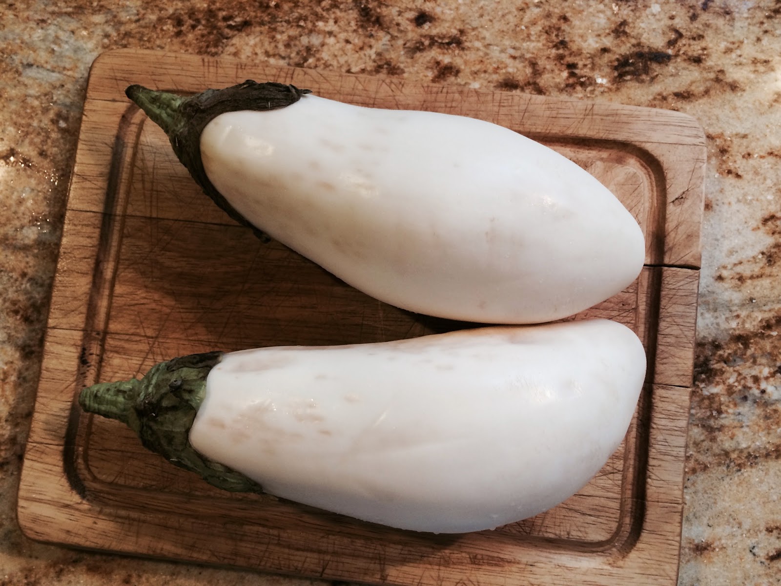 Have you ever seen or had white eggplant? I saw these at my grocery store last week and I always get such a kick out of trying the unusual. I thought these looked like little baby beluga whales Ha! And how to prepare them? Absolutely no idea. By the way, these look huge but the aren't. They're on a small cutting board.